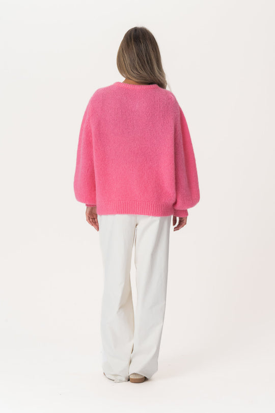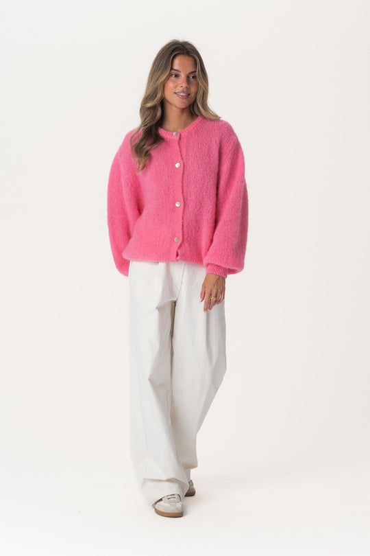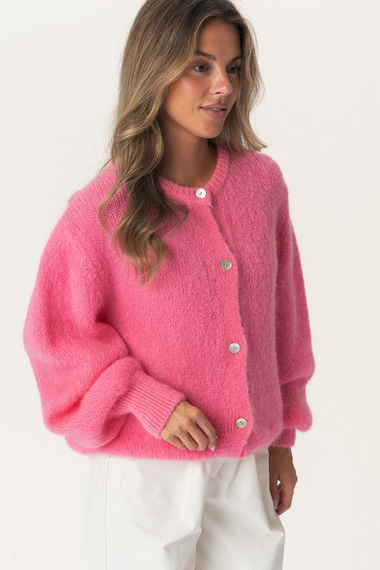 Luddrig mohairkofta med långa voluminösa ärmar, ribbdetaljer och pärlemorlook på knapparna.