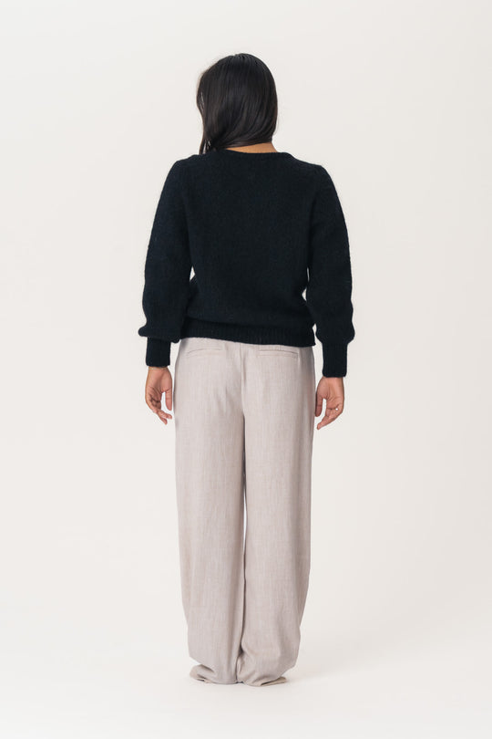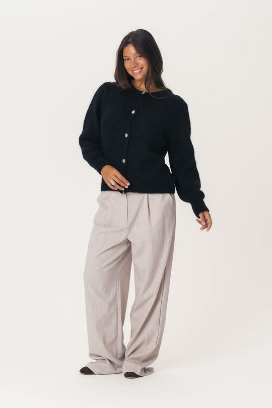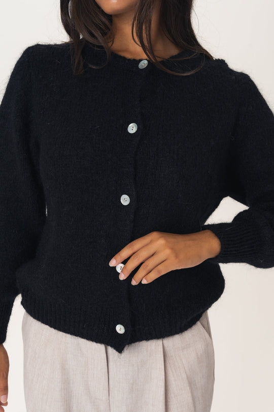 Luddrig mohairkofta med långa voluminösa ärmar, ribbdetaljer och pärlemorlook på knapparna.