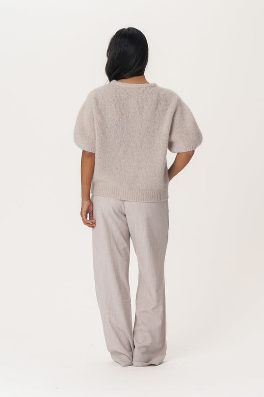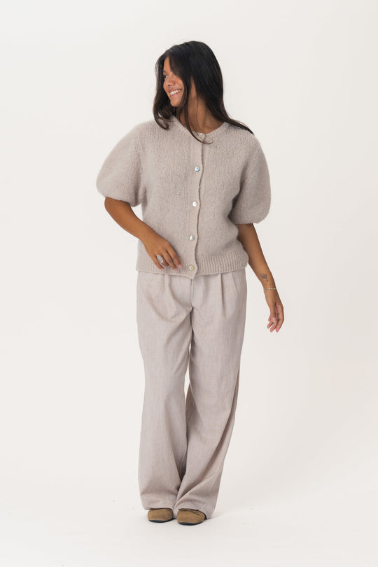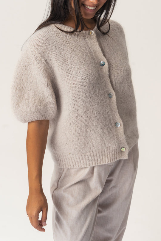 Luddrig mohairkofta med långa voluminösa korta ärmar, ribbdetaljer och pärlemorlook på knapparna.