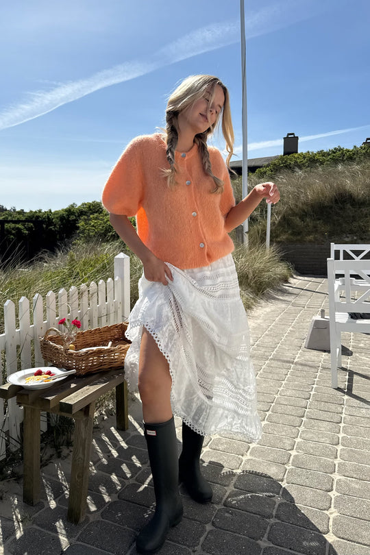 Luddrig mohairkofta med långa voluminösa korta ärmar, ribbdetaljer och pärlemorlook på knapparna.
