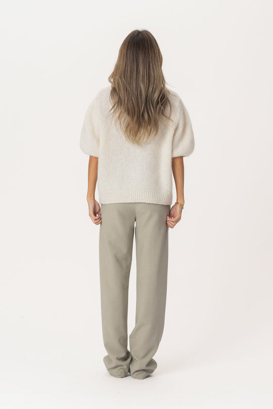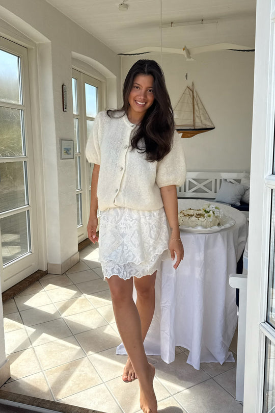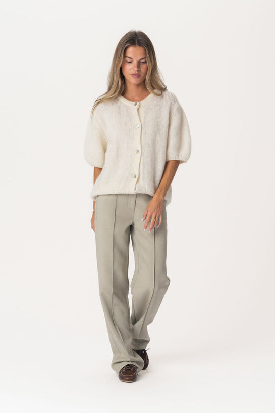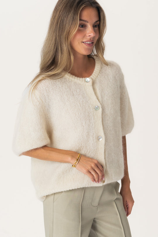 Luddrig mohairkofta med långa voluminösa korta ärmar, ribbdetaljer och pärlemorlook på knapparna.