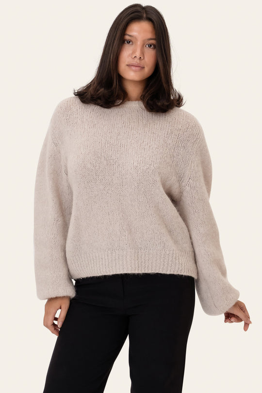 En mjuk och luftig stickad plagg i en vacker beige nyans som utstrålar femininitet och mysighet. Designad med en avslappnad passform, rund halsringning och lätt ballongformade ärmar som skapar ett elegant fall och en avslappnad silhuett. Tillverkad av ett lätt och fluffigt material som känns skonsamt mot huden och håller dig varm utan att vara tungt. Perfekt att styla med jeans, kjolar eller lager på lager över klänningar – ett mångsidigt måste i garderoben.