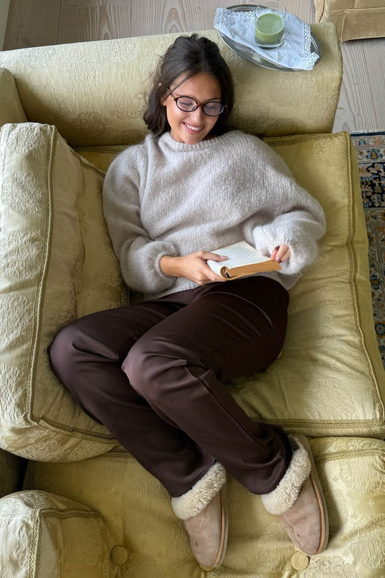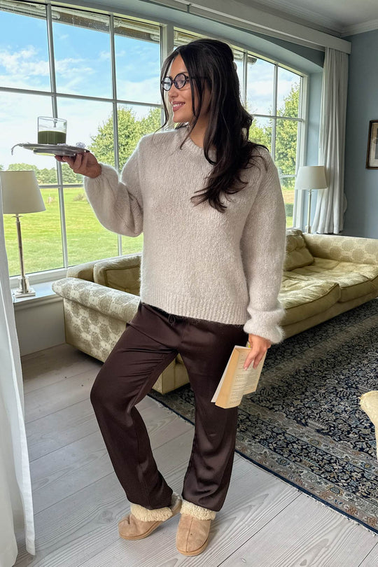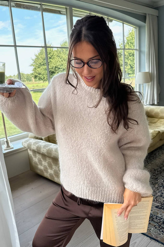 Fuskig mohairtröja med långa ärmar, lätt puffade av smala ribbade muddar. Stickningen har en rund halsringning, avslutad med fin ribbstickning i både fåll och krage för en elegant look.