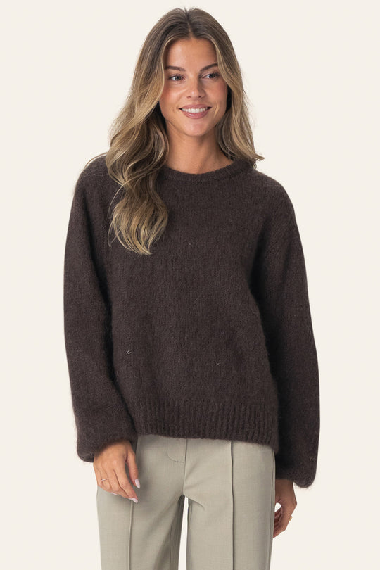 En mjuk och luftig stickad pjäs i en vacker mörkbrun nyans som utstrålar femininitet och mysighet. Designad med en avslappnad passform, rund halsringning och lätt ballongformade ärmar som skapar ett elegant fall och en avslappnad silhuett. Tillverkad av ett lätt och fluffigt material som känns skonsamt mot huden och håller dig varm utan att vara tung. Perfekt att styla med jeans, kjolar eller lager på lager över klänningar – ett mångsidigt måste i garderoben.