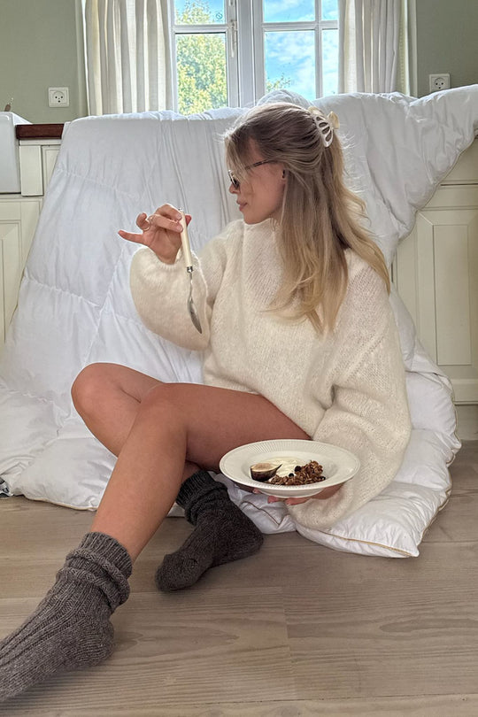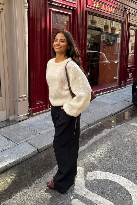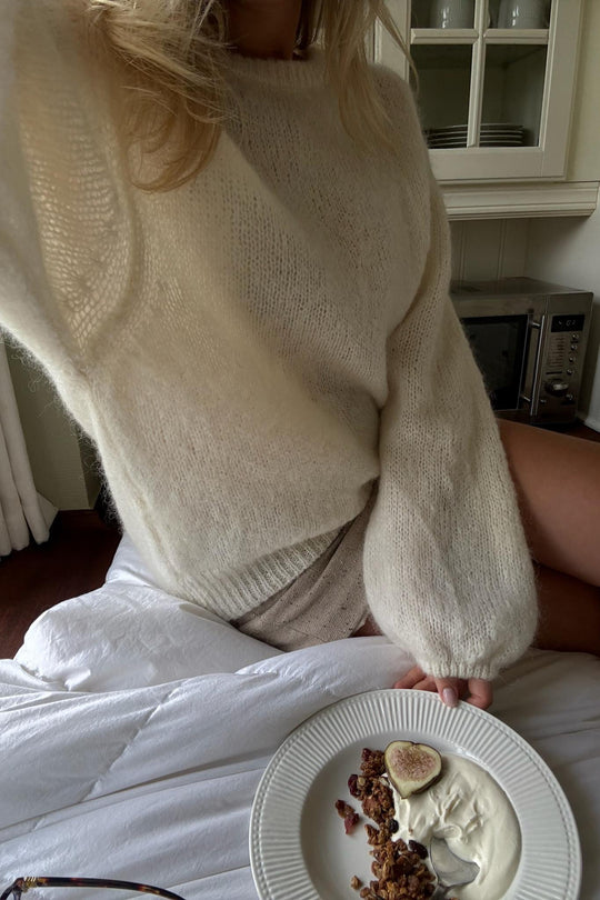 En vacker fuzzy mohair-tröja i vitt. Koftan har långa ärmar med åtsittande ribbade muddar som ger ärmarna ett mjukt puffigt utseende. En matchande ribbad kant finns också vid fållen och runt den runda halsringningen, vilket skapar en voluminös silhuett.