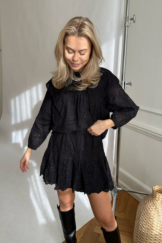 Cute blouse with embroidery- and ruffle details, match it with our Ingrid skirt.