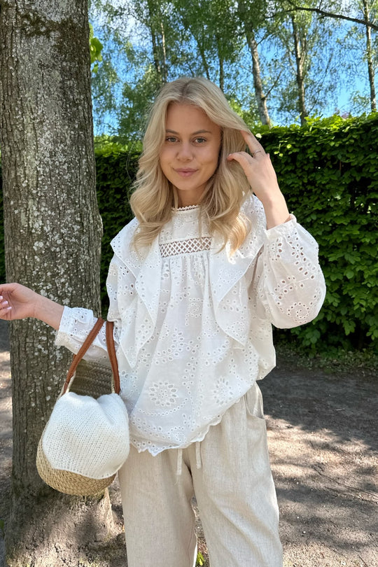 Cute blouse with embroidery- and ruffle details, match it with our Ingrid skirt.