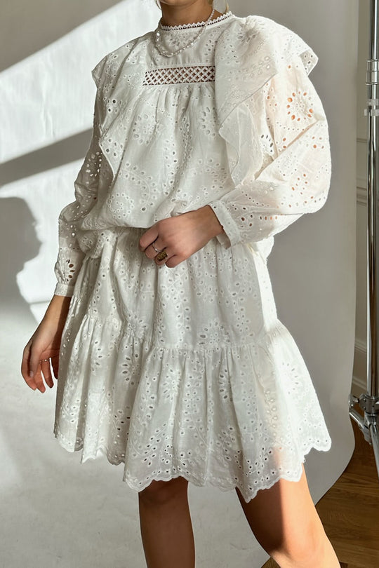 Cutest skirt with rubberband around the waist, embroidery- and ruffle details.