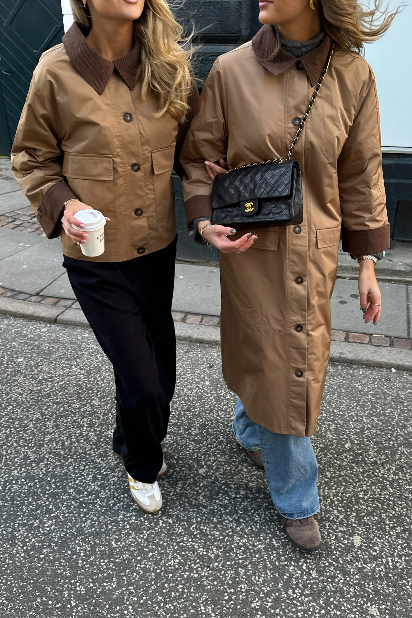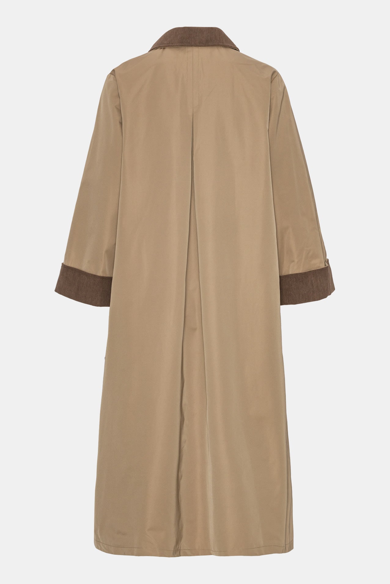 Long jacket in brown with two front pockets, buttons as closure and corduroy details on collar and sleeves.
