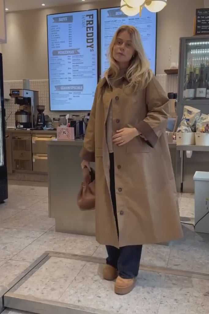 It is a trenchcoat without lining and is perfect for spring and summer. The sleeves are cut off to show the wrist.
