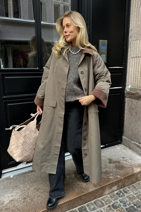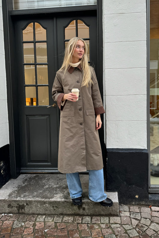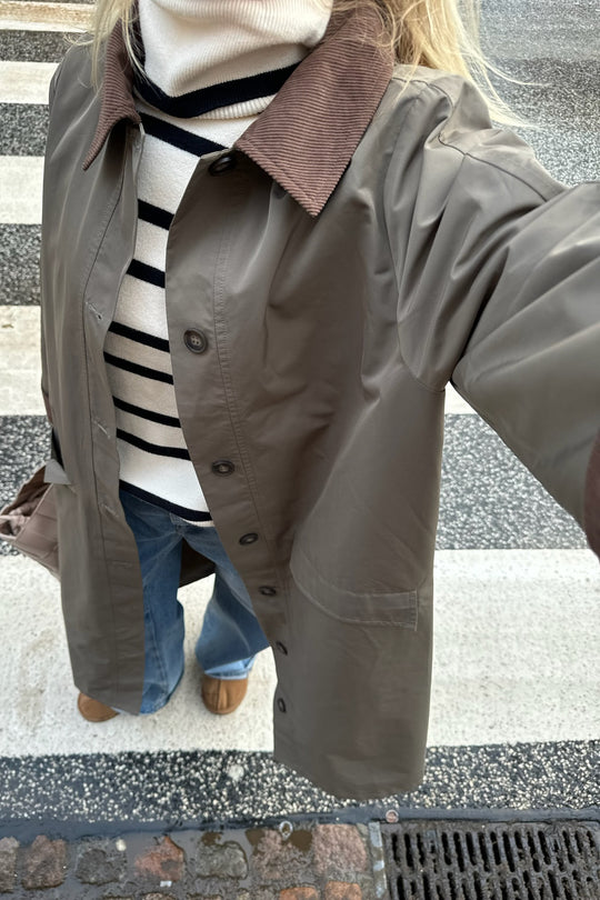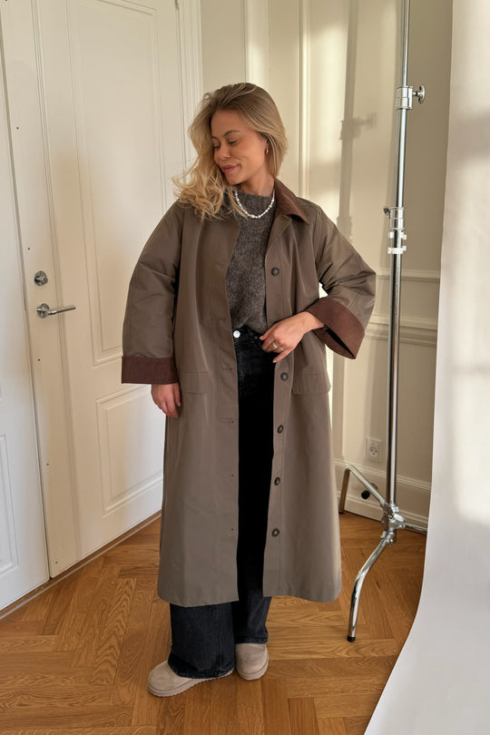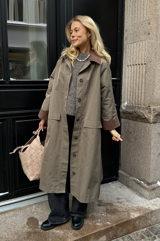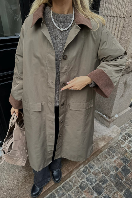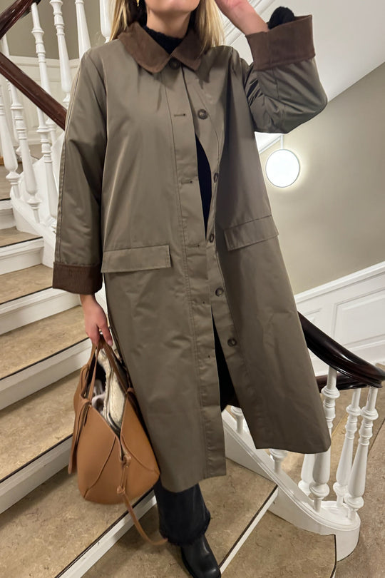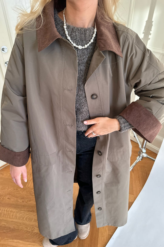 Long jacket in khaki/green with two front pockets, buttons as closure and corduroy details on collar and sleeves.