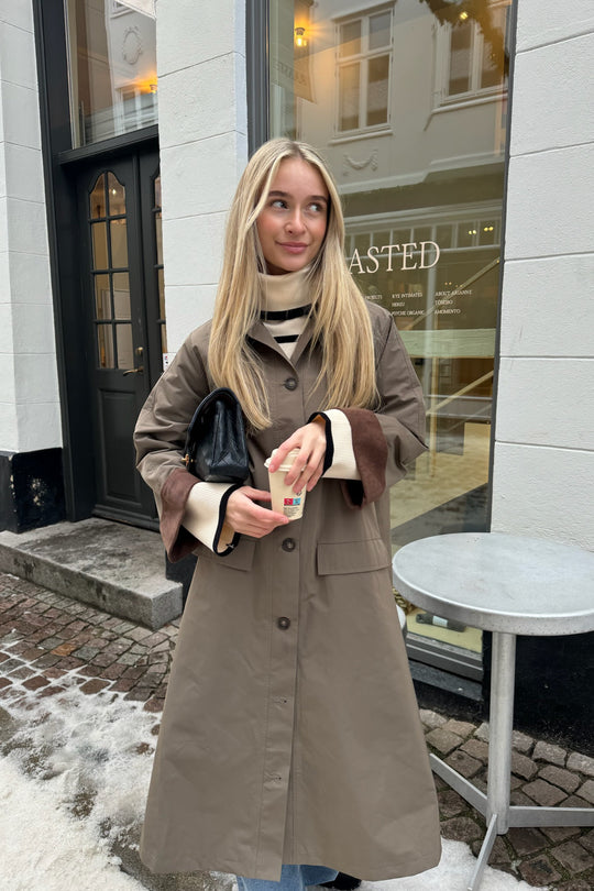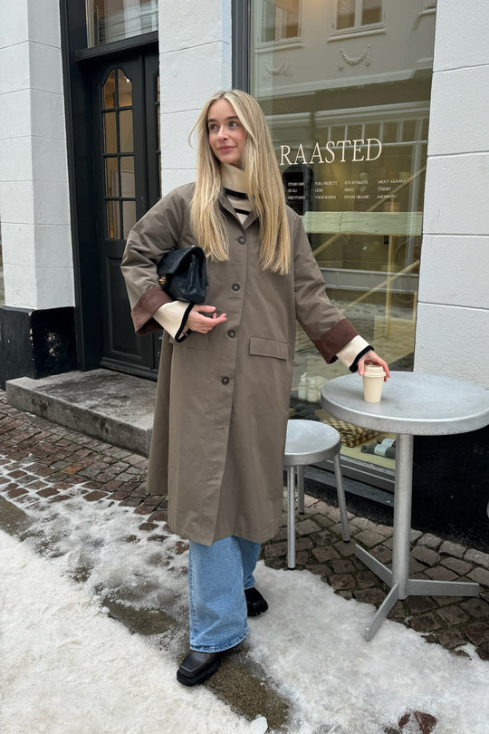 It is a trenchcoat without lining and is perfect for spring and summer. The sleeves are cut off to show the wrist.
