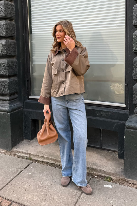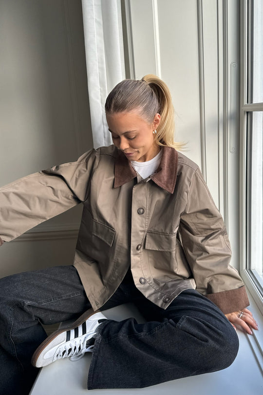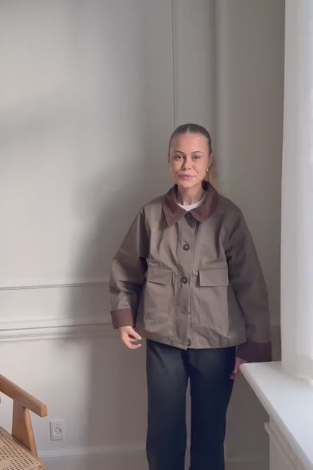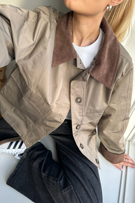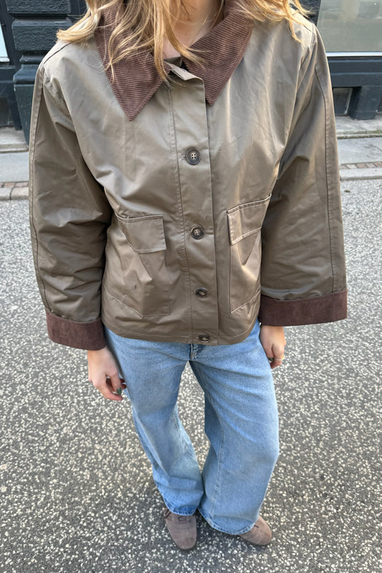 Short jacket in khaki/green with two fake front pockets, but two real side pockets, buttons as closure and corduroy details on collar and sleeves.