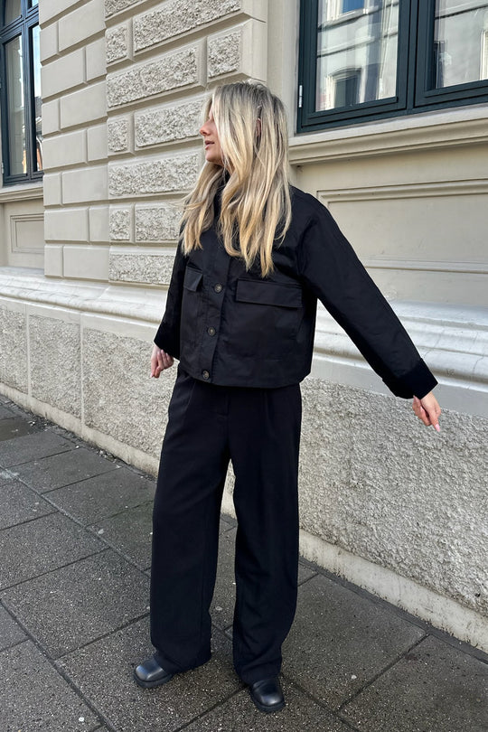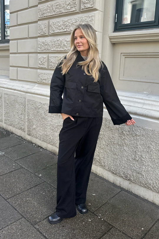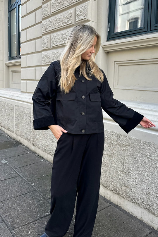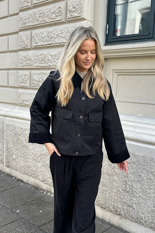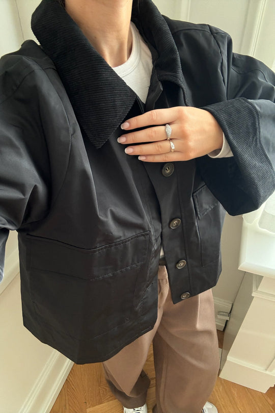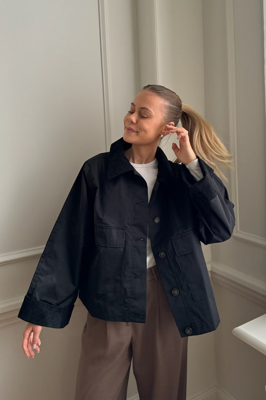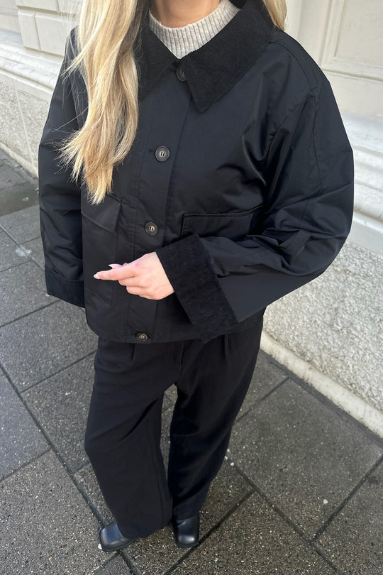 Short jacket in black with two fake front pockets, but real side pockets, buttons as closure and corduroy details on collar and sleeves.