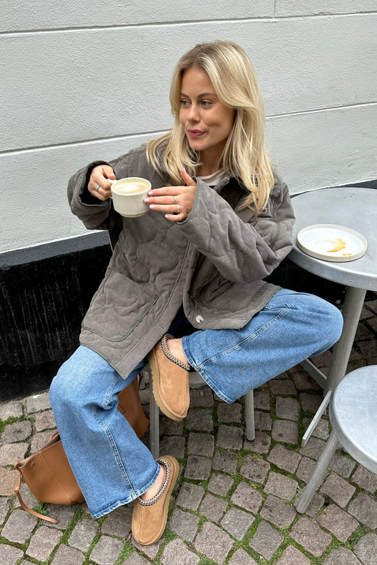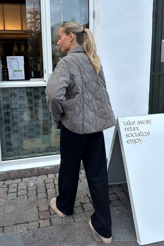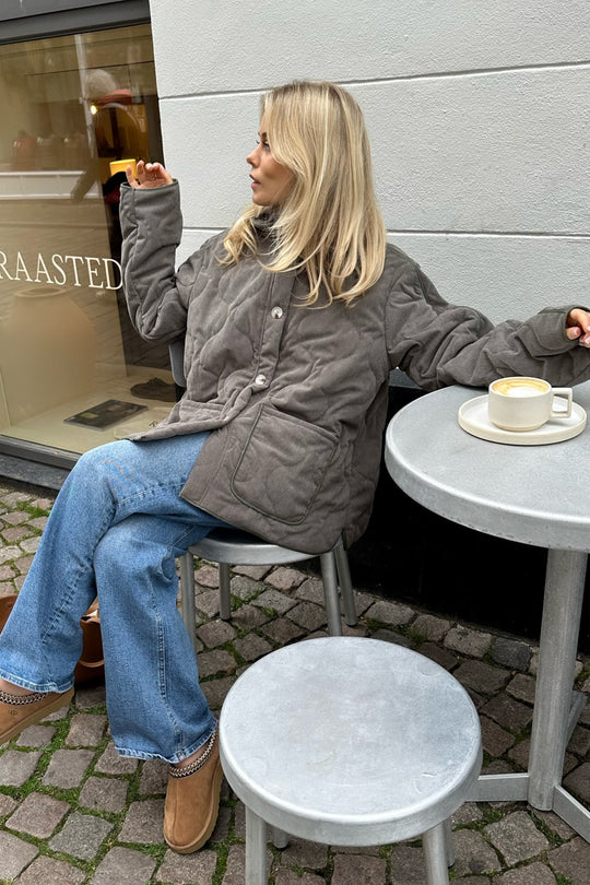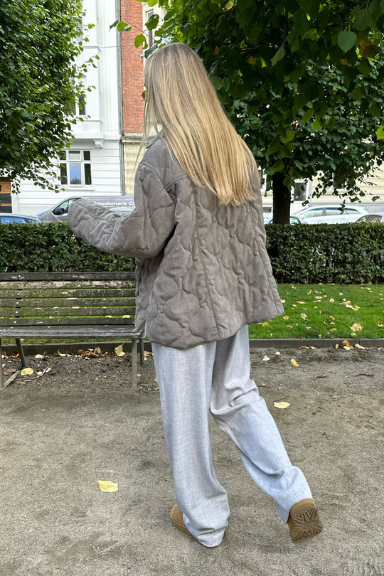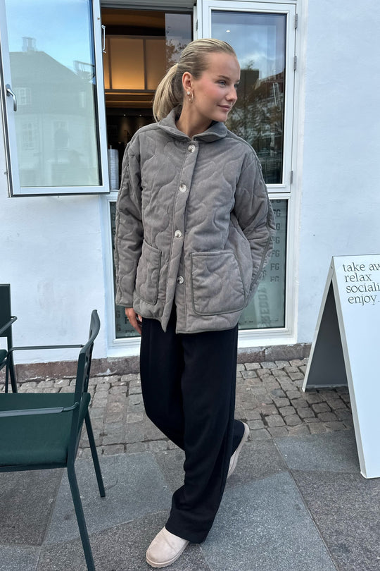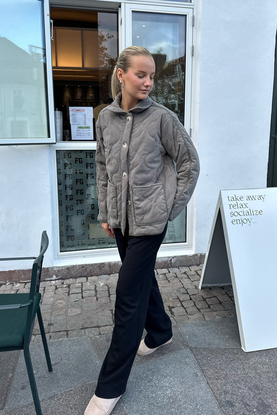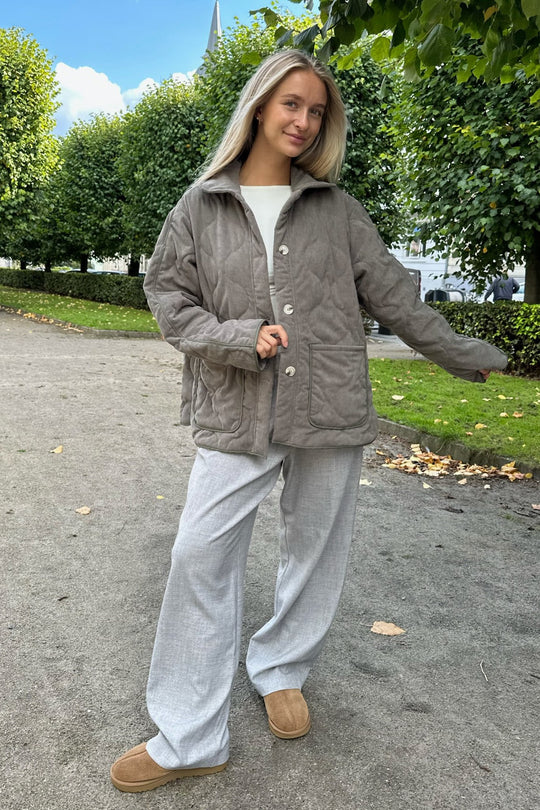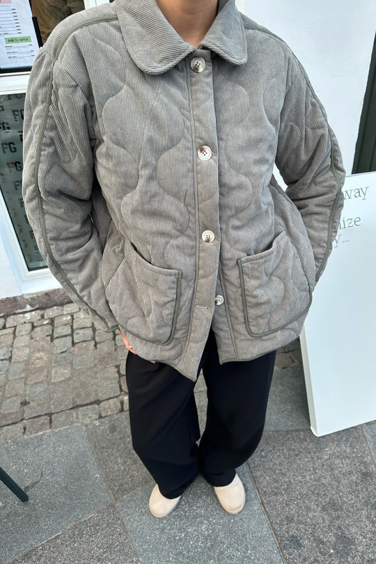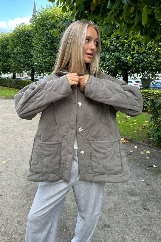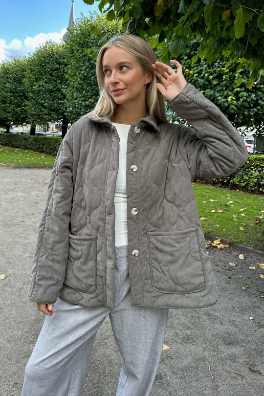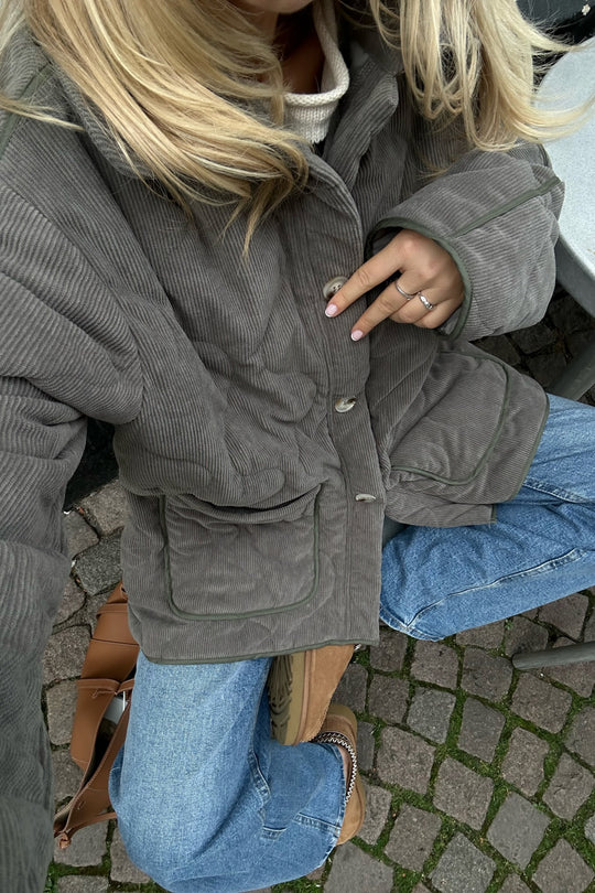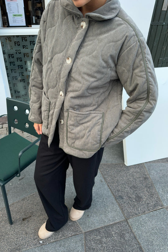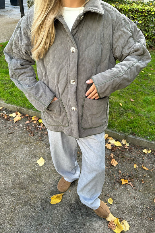Oversize grey quilted jacket in corduroy with two front pockets, collar and buttons as closure.