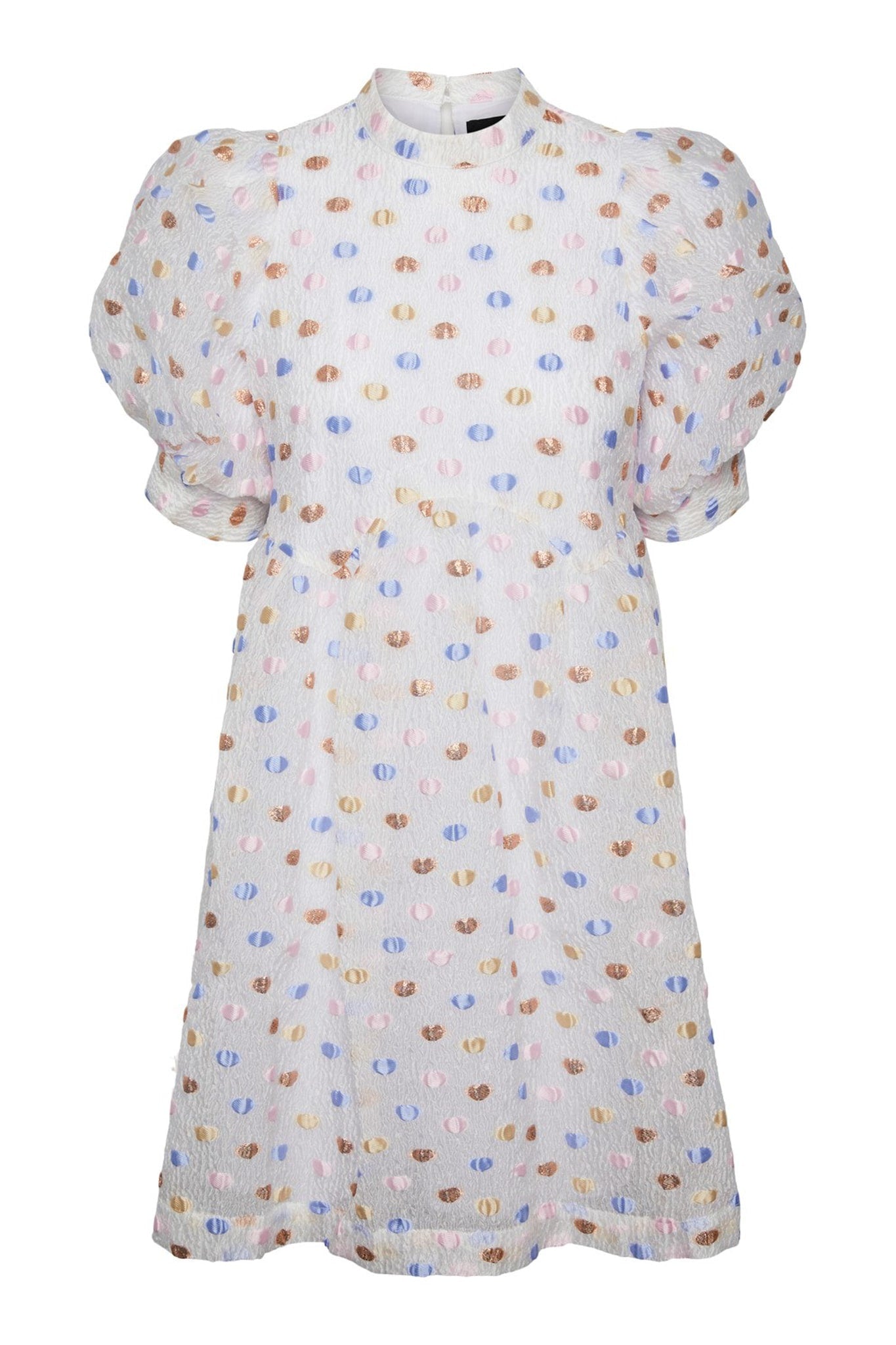 Cutest white dress with dots in blue, gold and pink colors. Short sleeves and a button on the back to close.