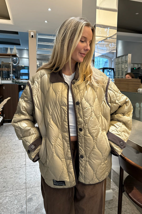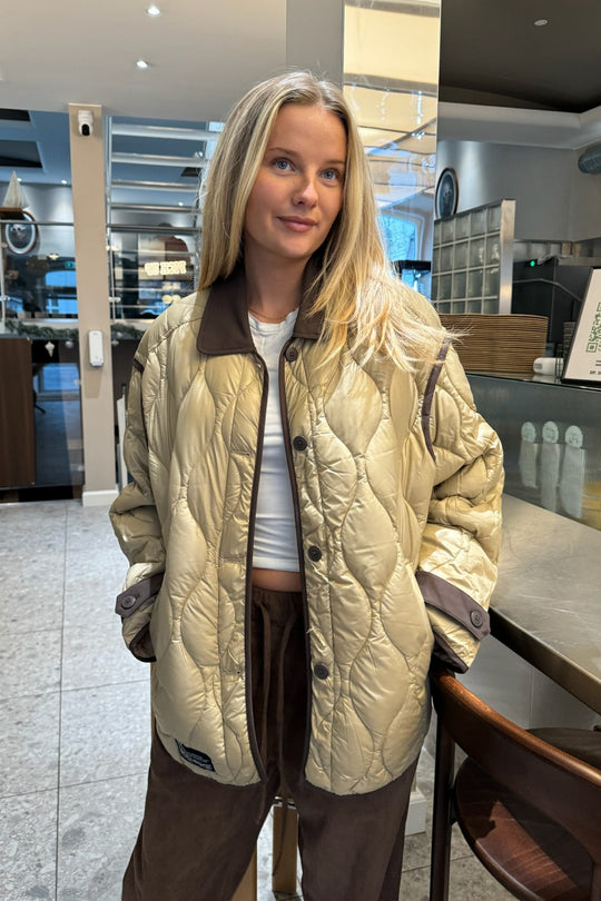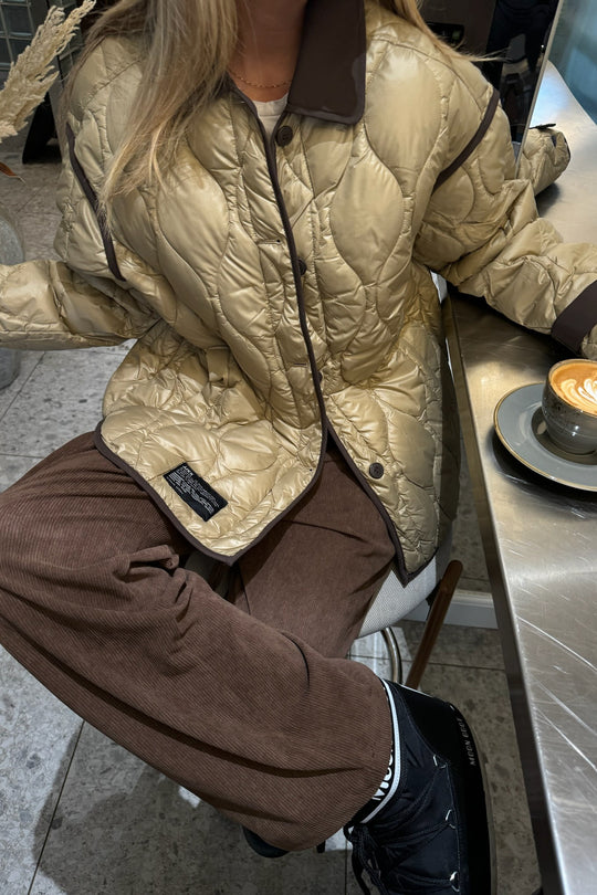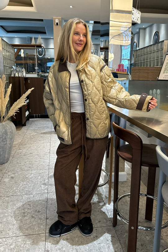 Quilted jacket with a brown collar, pockets and dark brown buttons as closure.