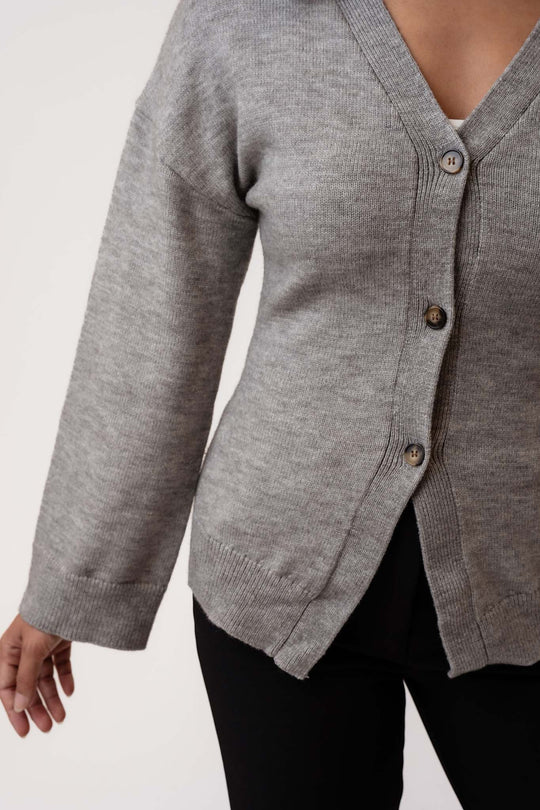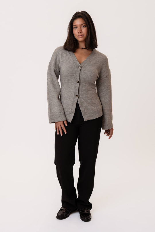 Mjuk åtsittande cardigan i ullblandning med ribbdetaljer. Den har vida ärmar och 3 knappar som stängning.