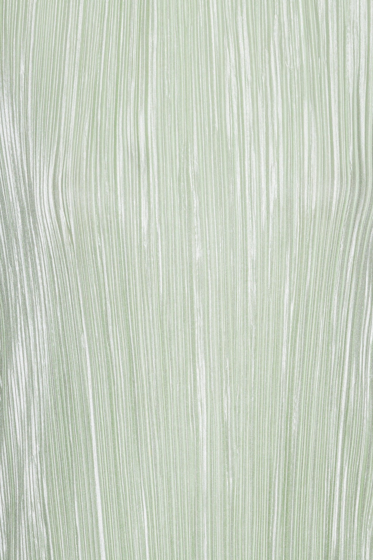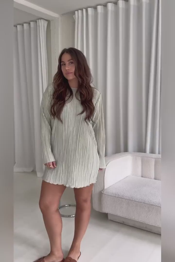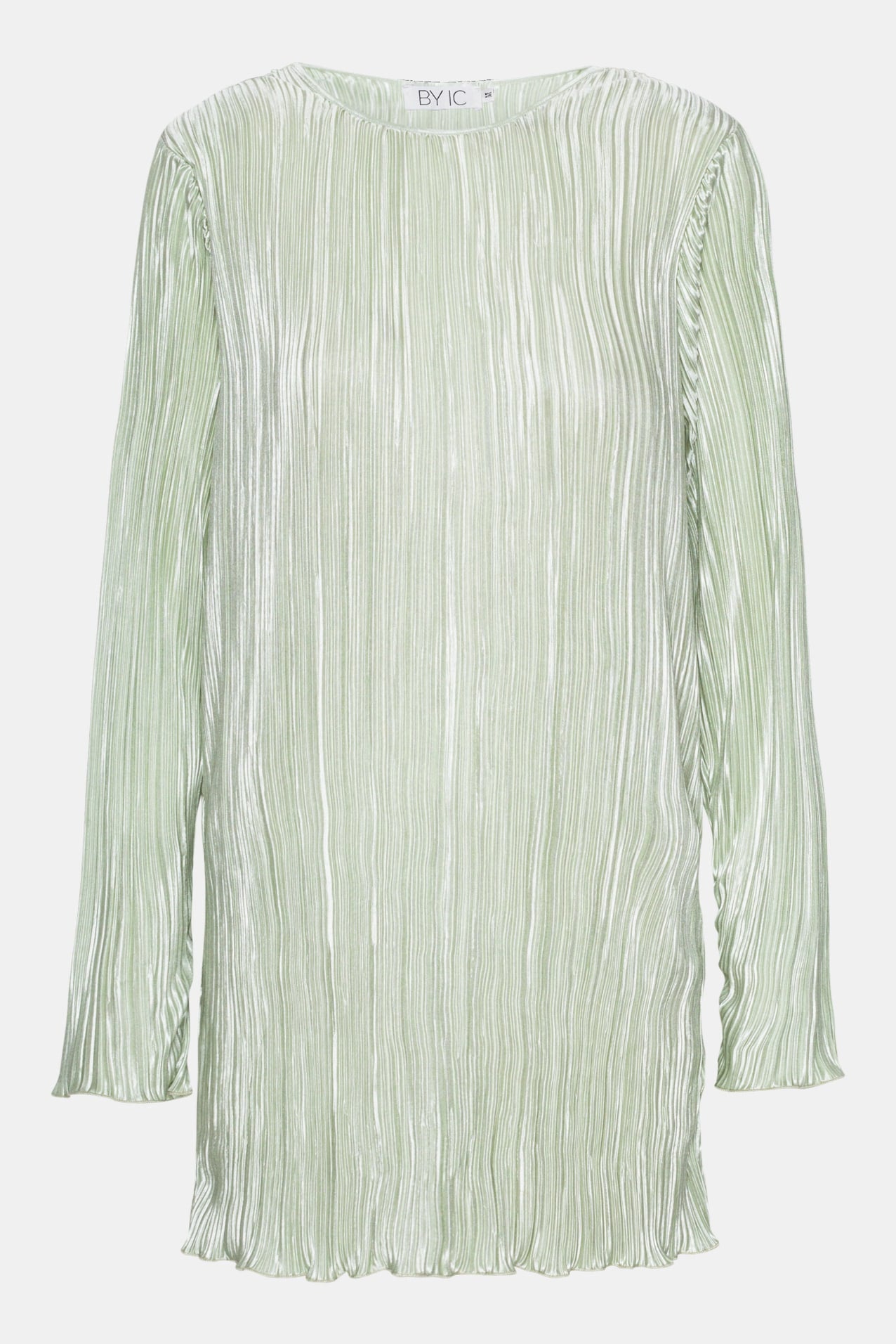 Kort plisséklänning i ljusgrönt med långa ärmar, små axelvaddar och en lös passform.