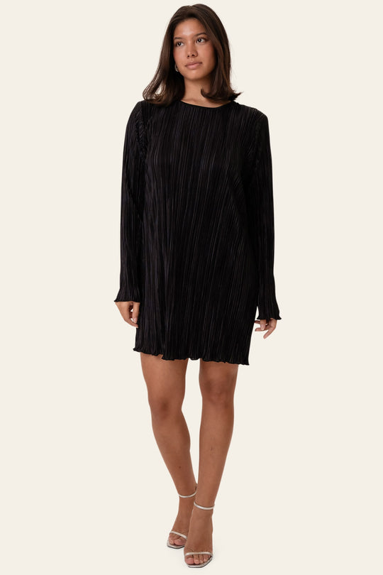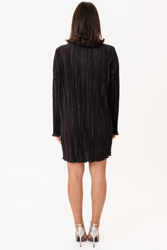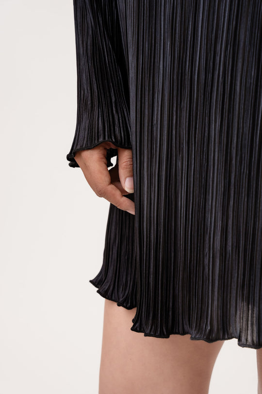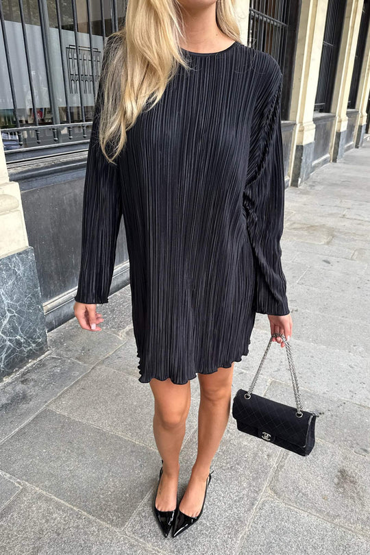 En elegant svart klänning tillverkad av ett vackert veckat tyg som rör sig graciöst och utstrålar sofistikering. Klänningen har en rak, avslappnad siluett som faller enkelt längs kroppen för en modern och raffinerad look. Diskreta axelvaddar ger designen en subtil struktur och en upphöjd och självsäker form. De långa ärmarna avslutas i mjukt utsvängda, vågiga kanter som framhäver klänningens feminina flöde. De lätt skimrande vecken fångar ljuset vackert, vilket gör den här klänningen perfekt för både speciella tillfällen och elegant vardagsbruk. Styla den med klackar och en clutch för en tidlös kvällslook, eller med platta skor för en elegant och diskret outfit.