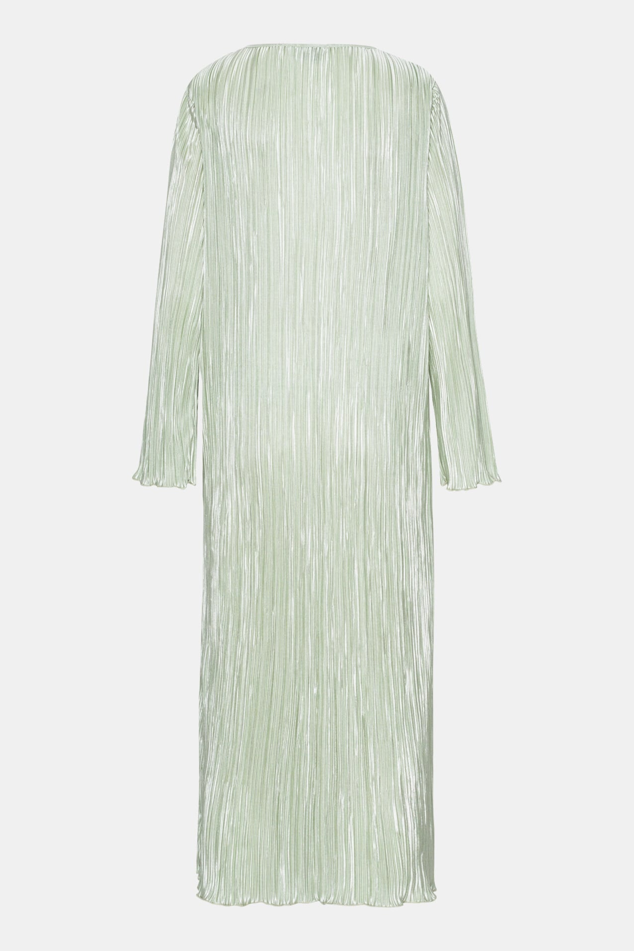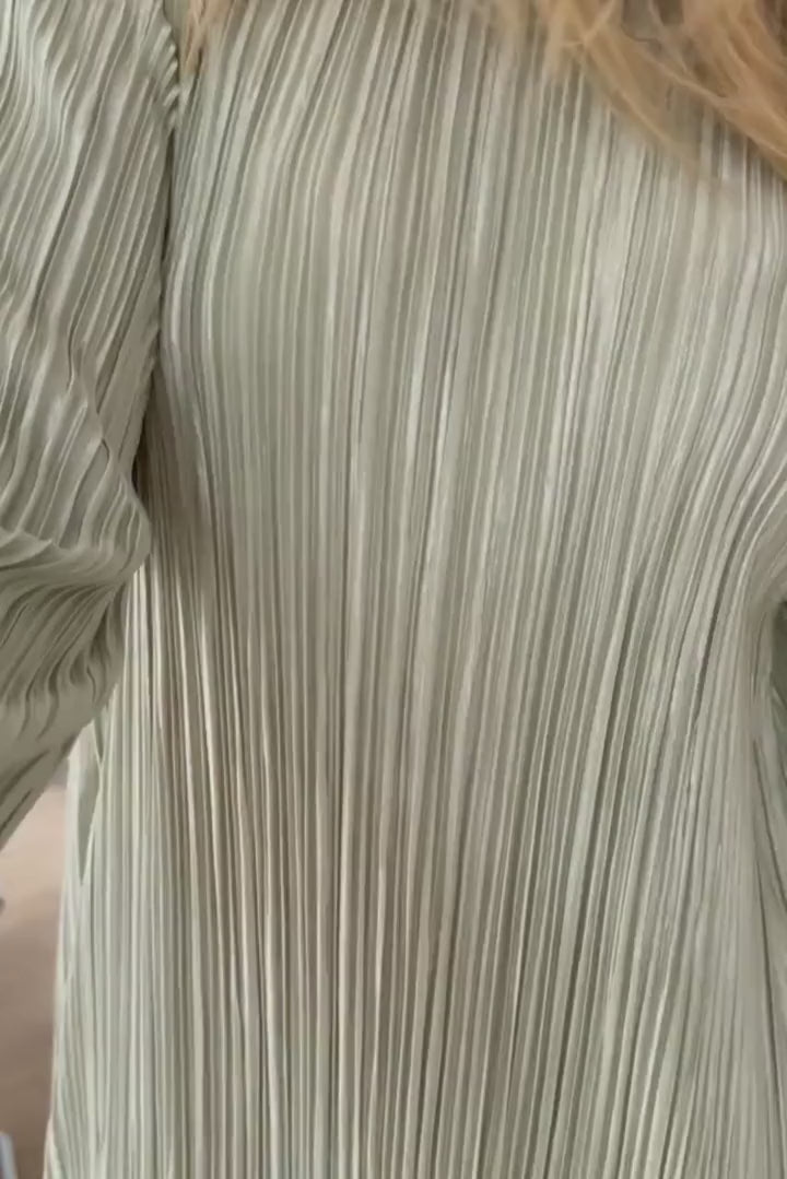 Long plissé dress light green with long sleeves, small shoulder pads and a loose fit.