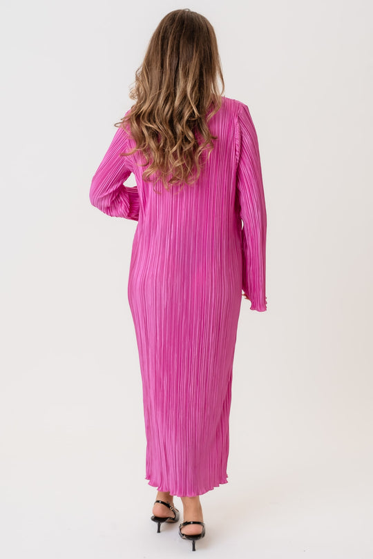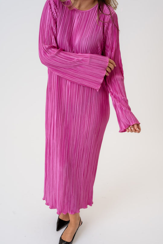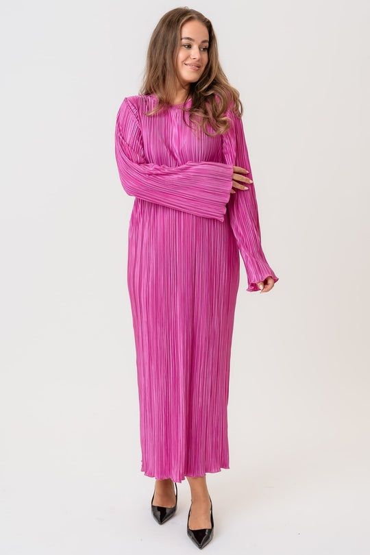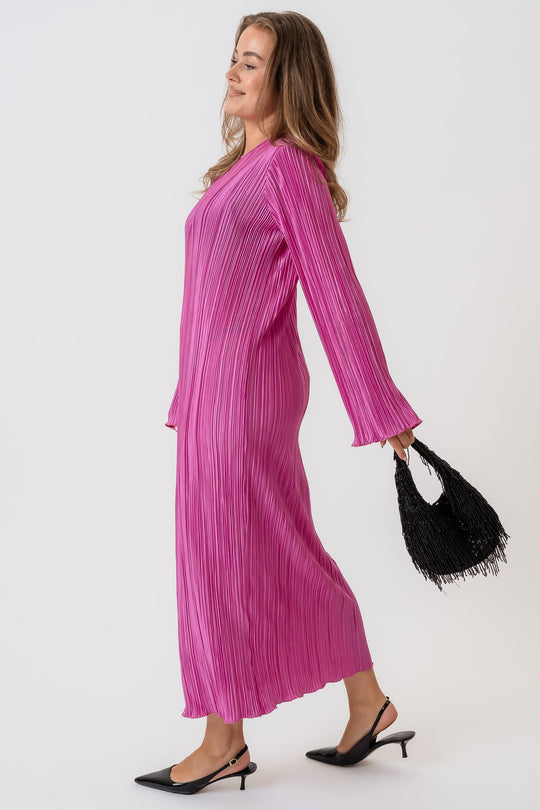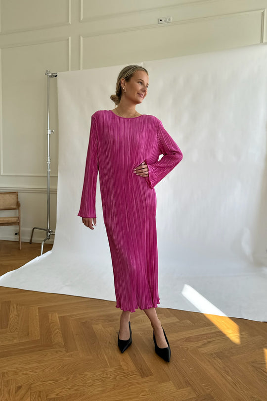 En elegant maxiklänning i en vibrerande rosa nyans, tillverkad av ett lätt, veckat tyg med en vacker lyster. Klänningen har en avslappnad rak passform som faller graciöst längs kroppen för en modern och avslappnad silhuett. Långa ärmar och rund halsringning kompletterar den enkla men sofistikerade designen. Mjukt vågiga fållar vid ärmarna och nederkanten för en feminin touch. Perfekt för speciella tillfällen eller när du vill göra ett färgglatt uttalande som blandar komfort med raffinerad elegans.