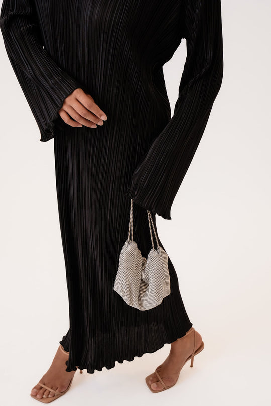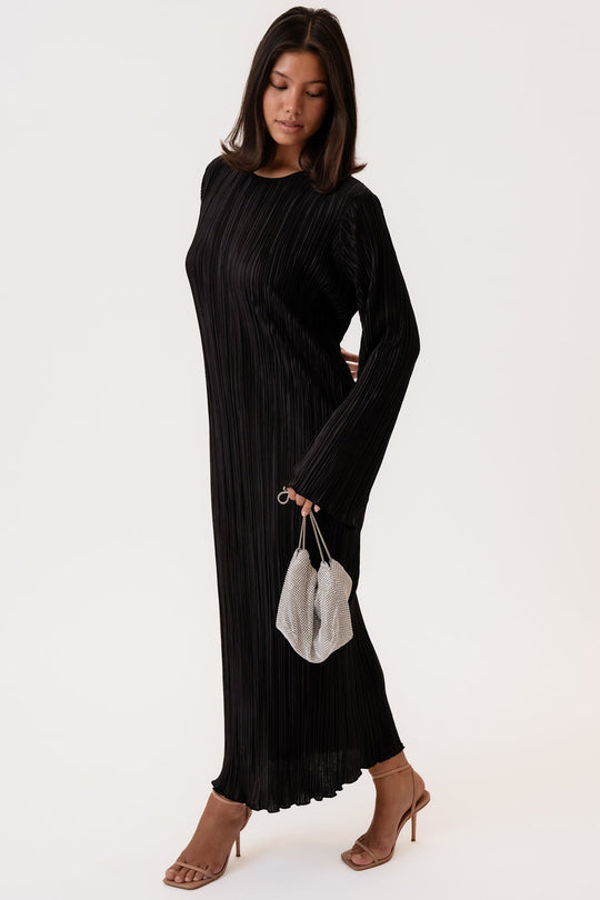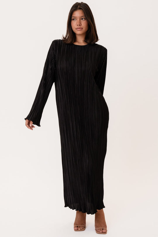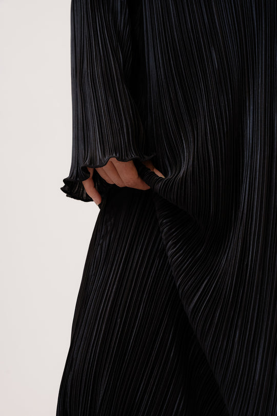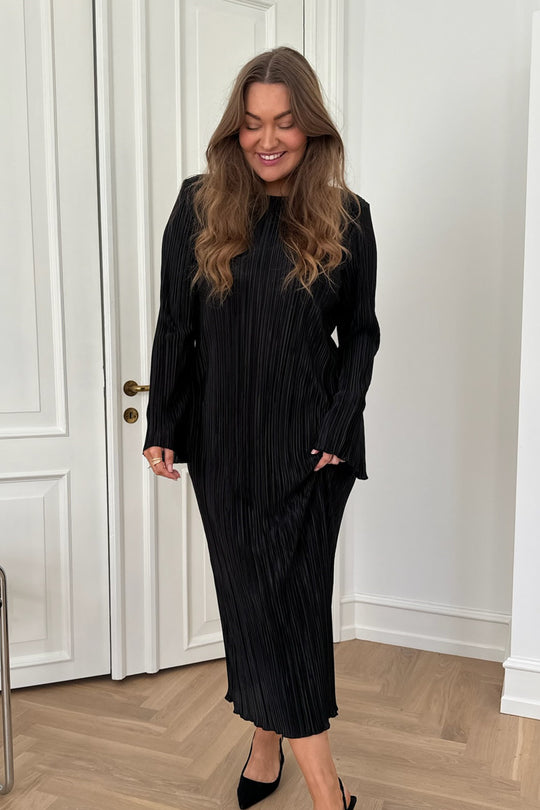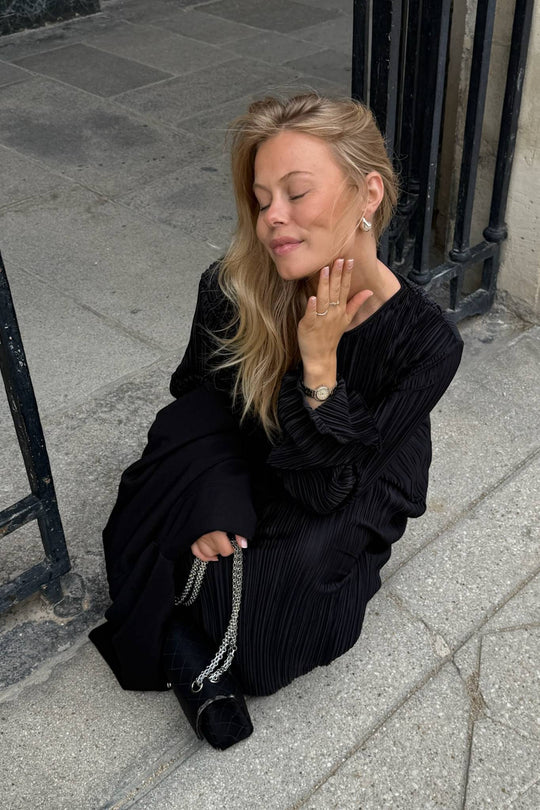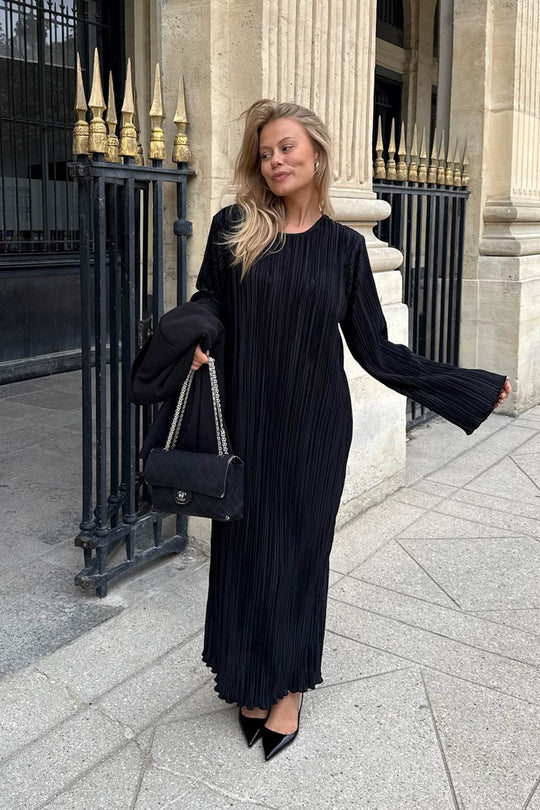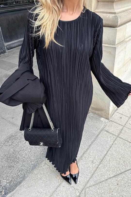 En elegant svart maxiklänning tillverkad av ett vackert veckat tyg som rör sig graciöst och utstrålar sofistikering. Klänningen har en rak, avslappnad silhuett som faller lätt längs kroppen för en modern och raffinerad look. Diskreta axelvaddar ger designen en subtil struktur och en upphöjd och självsäker form. De långa ärmarna avslutas i mjukt utsvängda, vågiga kanter som förstärker klänningens feminina flöde. De lätt skimrande vecken fångar ljuset vackert, vilket gör denna klänning perfekt för både speciella tillfällen och elegant vardagsbruk. Styla den med klackar och en clutch för en tidlös kvällslook, eller med platta skor för en elegant och diskret outfit.