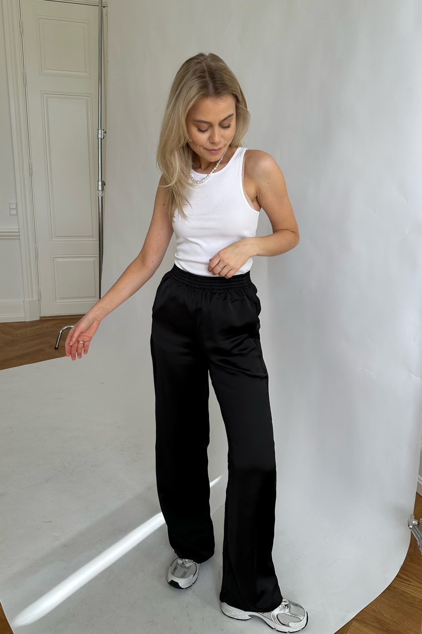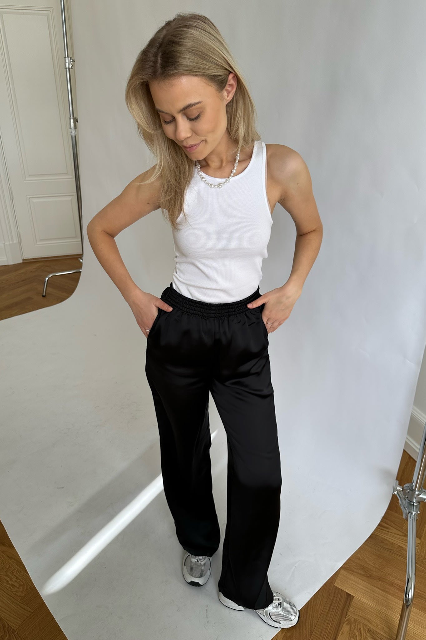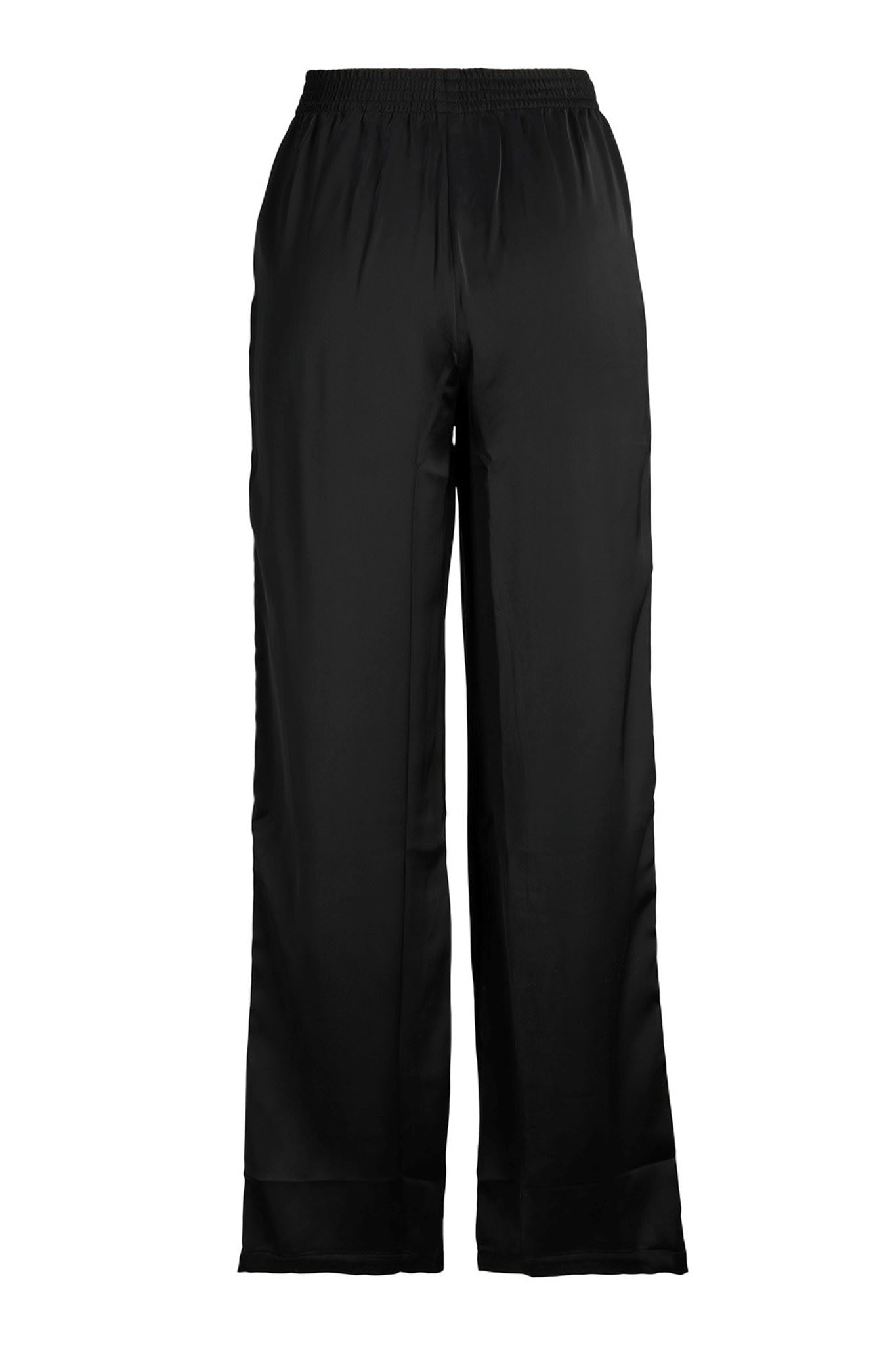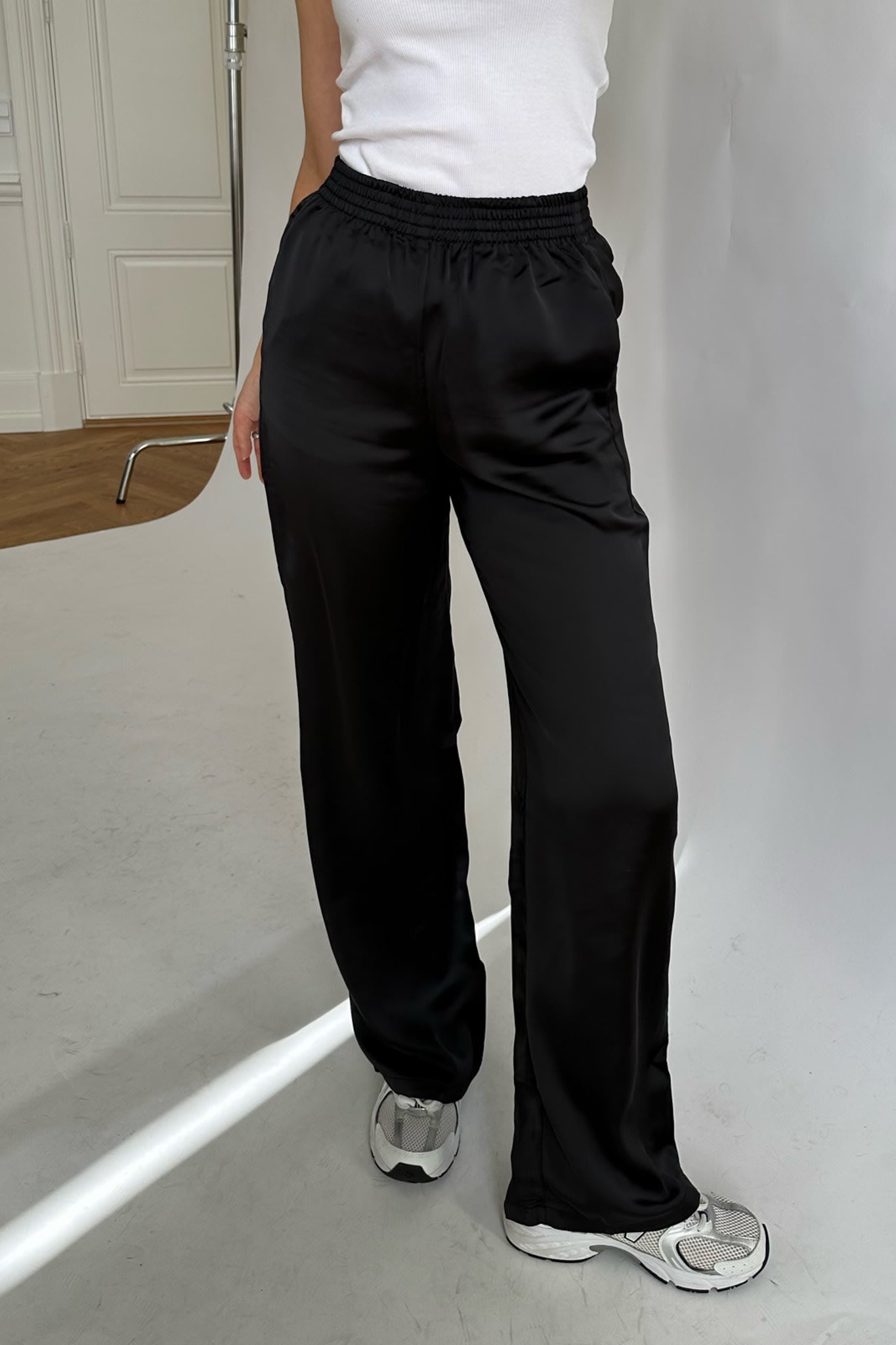 Satin pants with a loose fit, pockets and a rubberband around the waist.