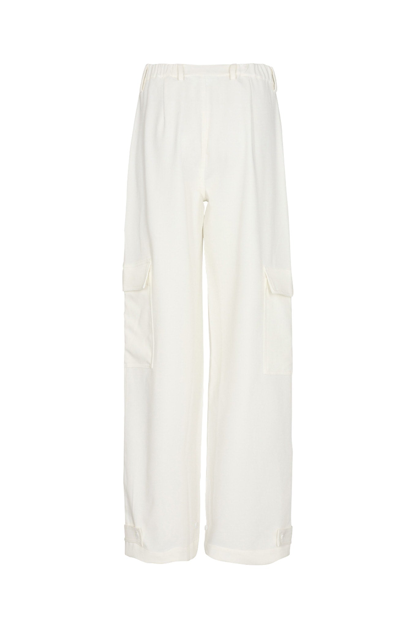White cargo pants with pockets and elastic band around the waist.