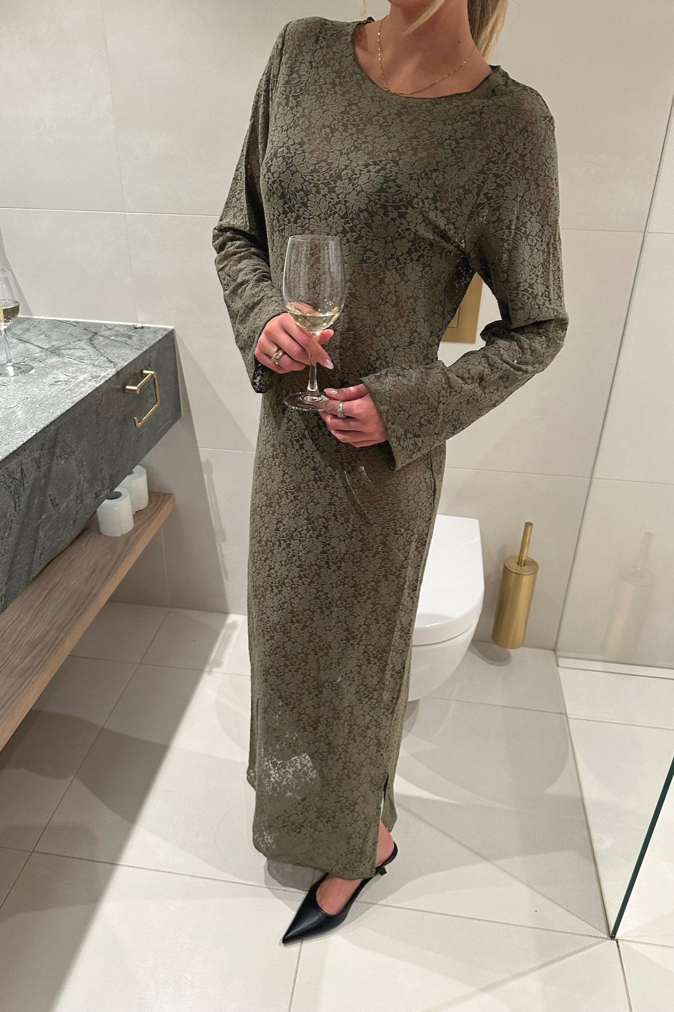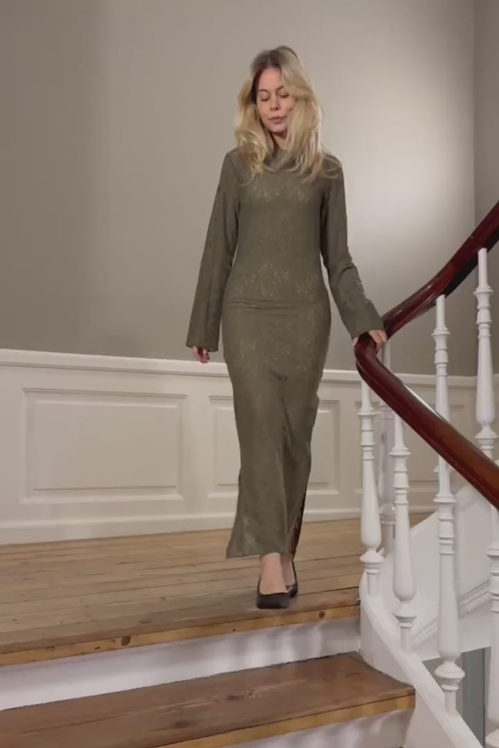 Army green maxi dress with long sleeves in transparent lace.