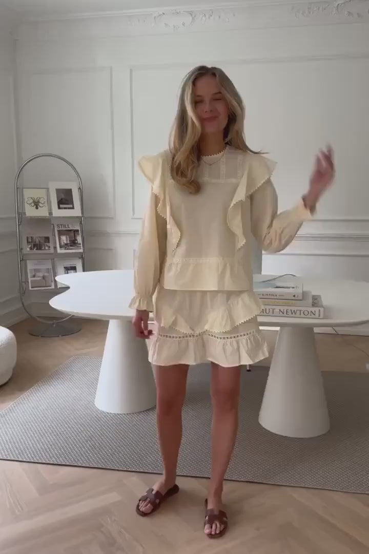 See through lace shirt in a unique vintage look med frill details, 7/8 sleeves and a high neck.