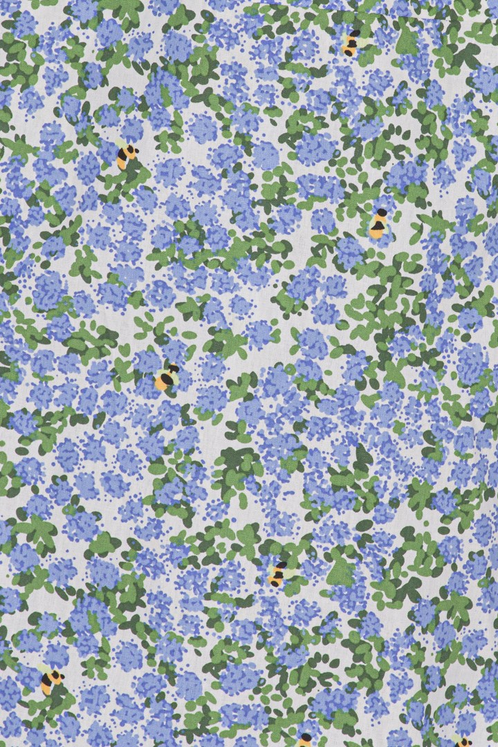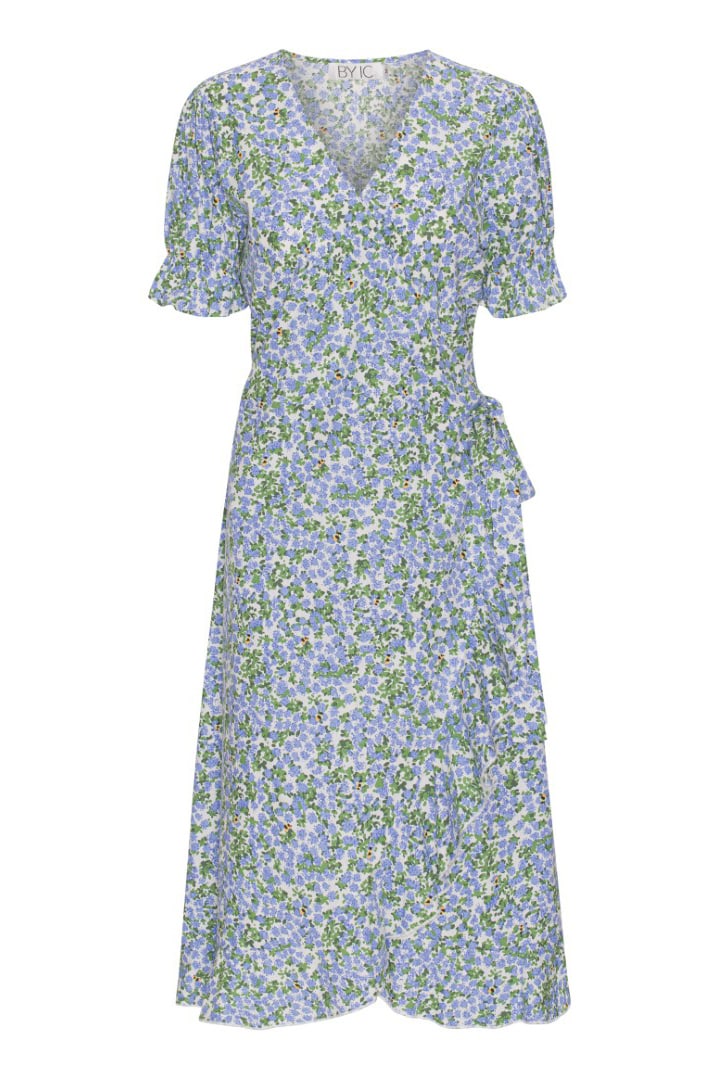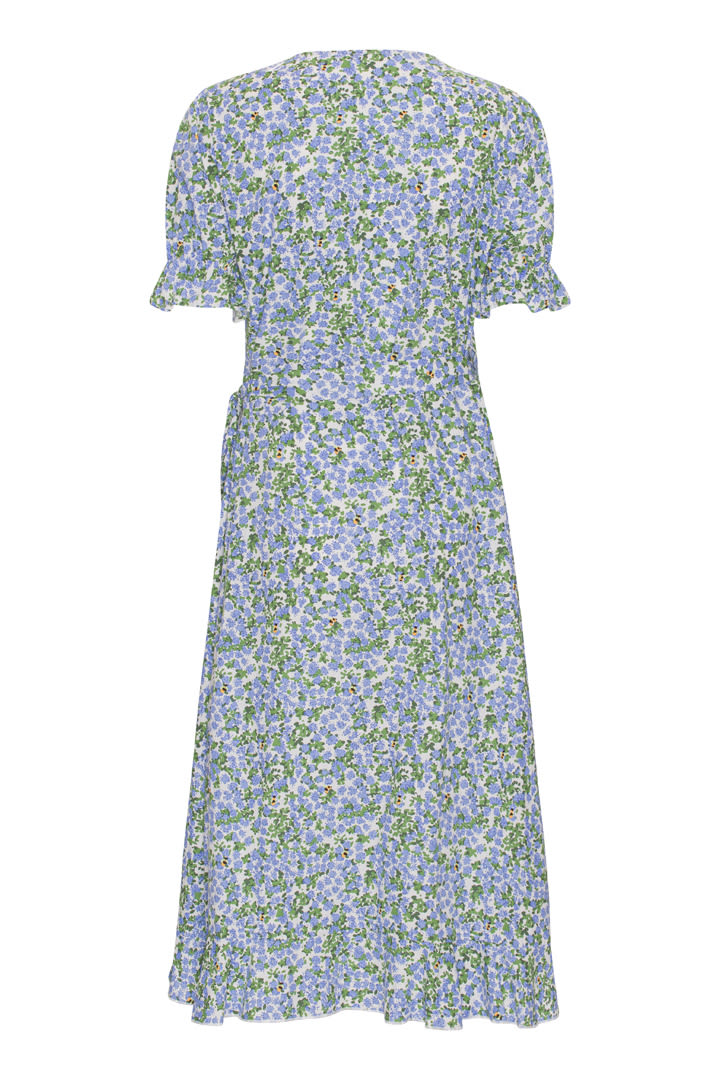 Beautiful long wrap dress in blue print with short puff sleeves.