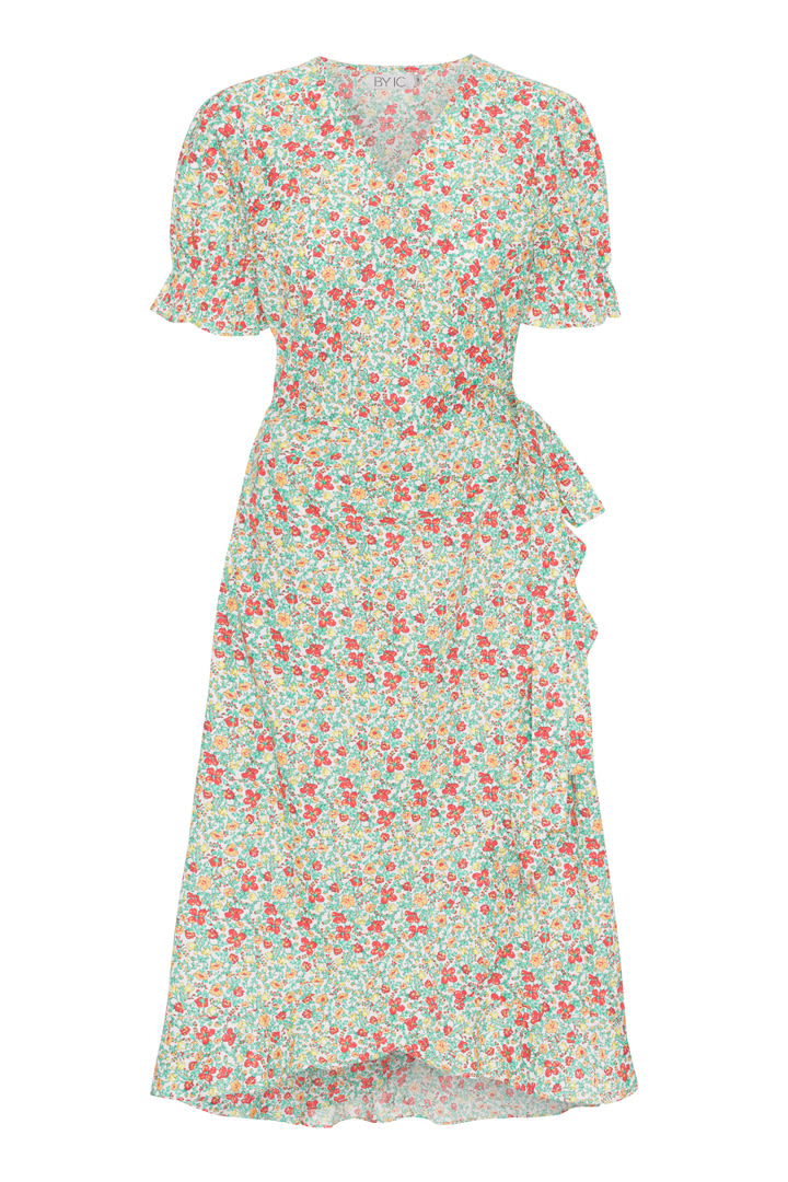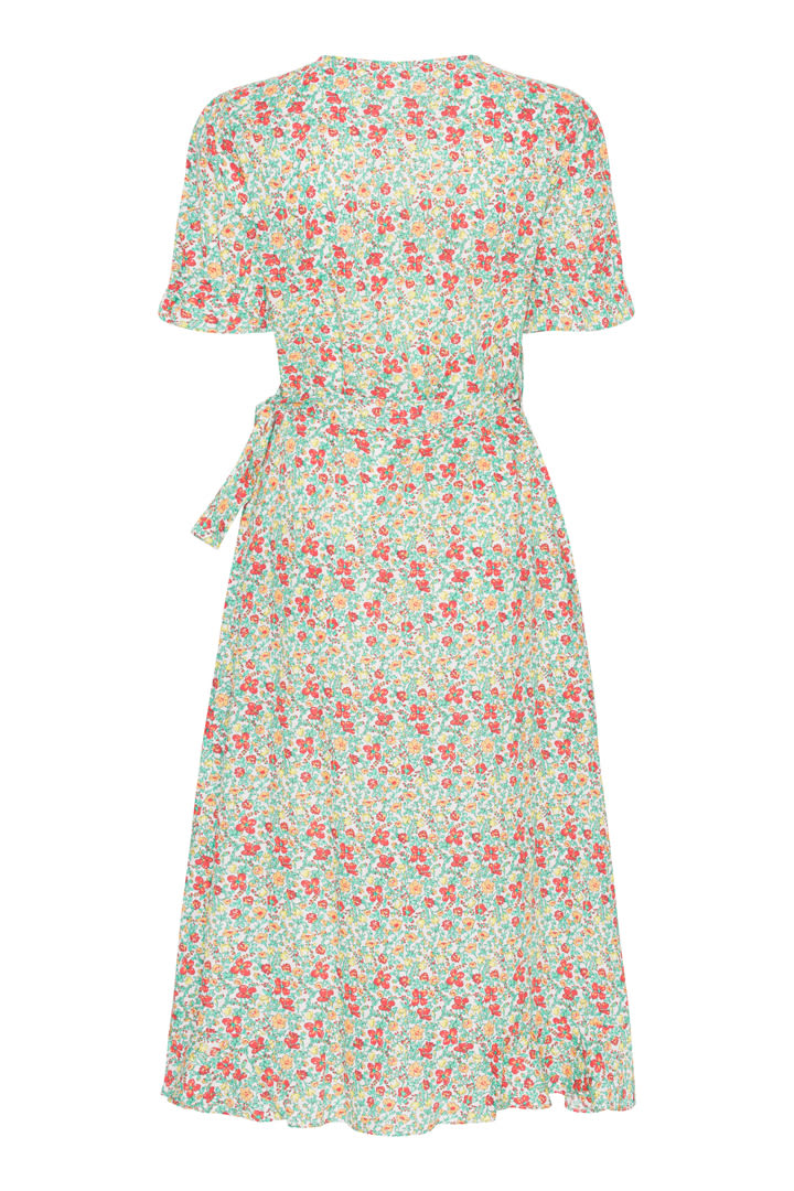 Flower printed, long wrap dress with a discreet chest button.