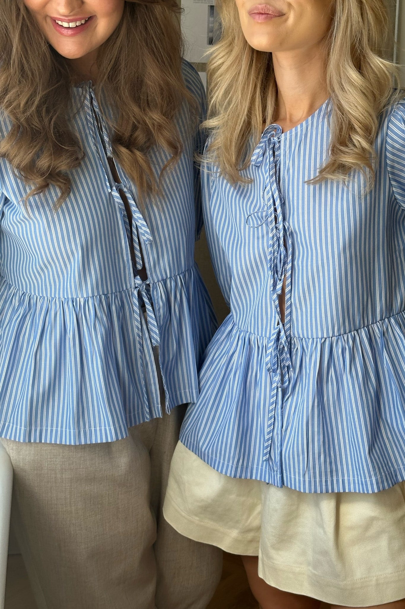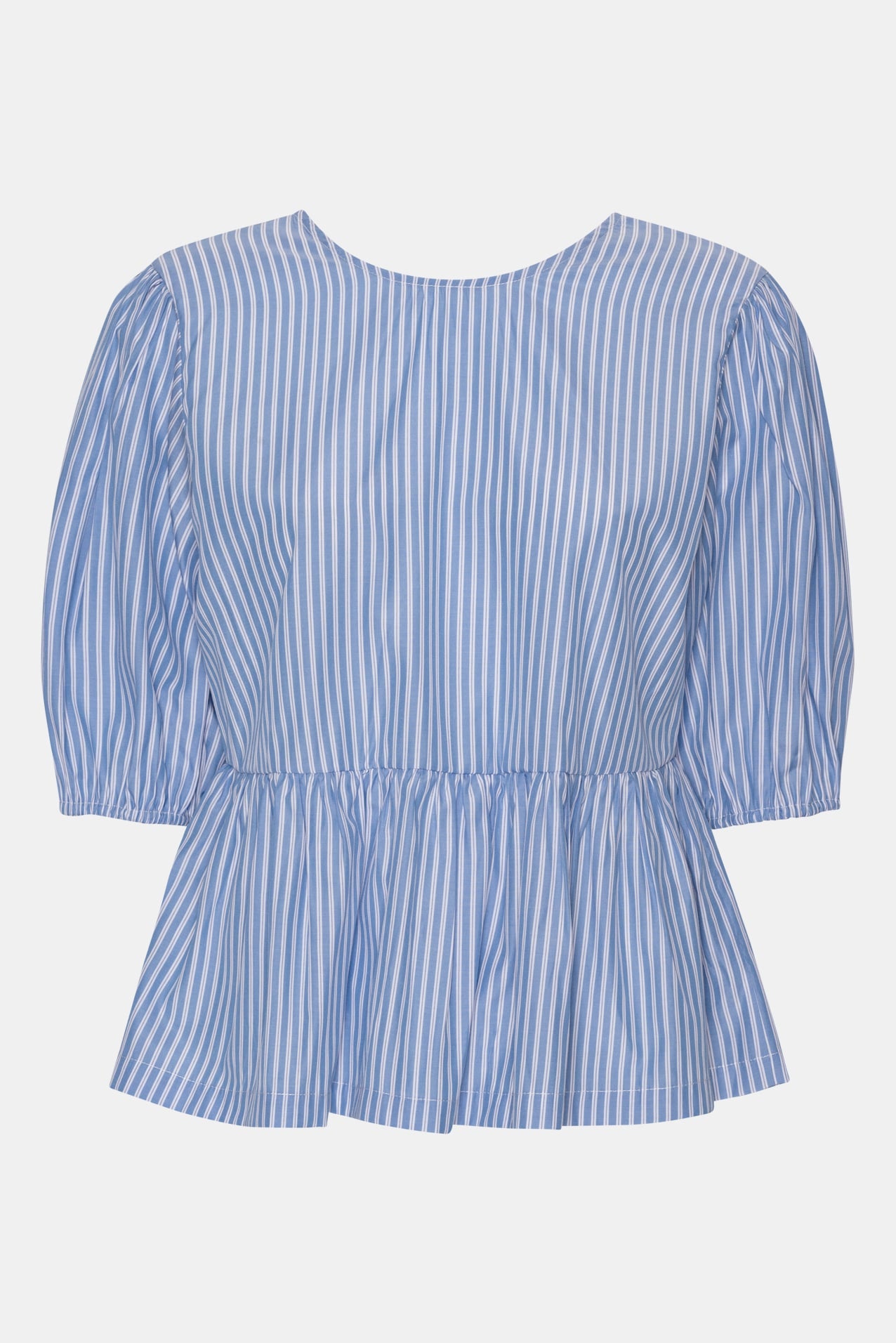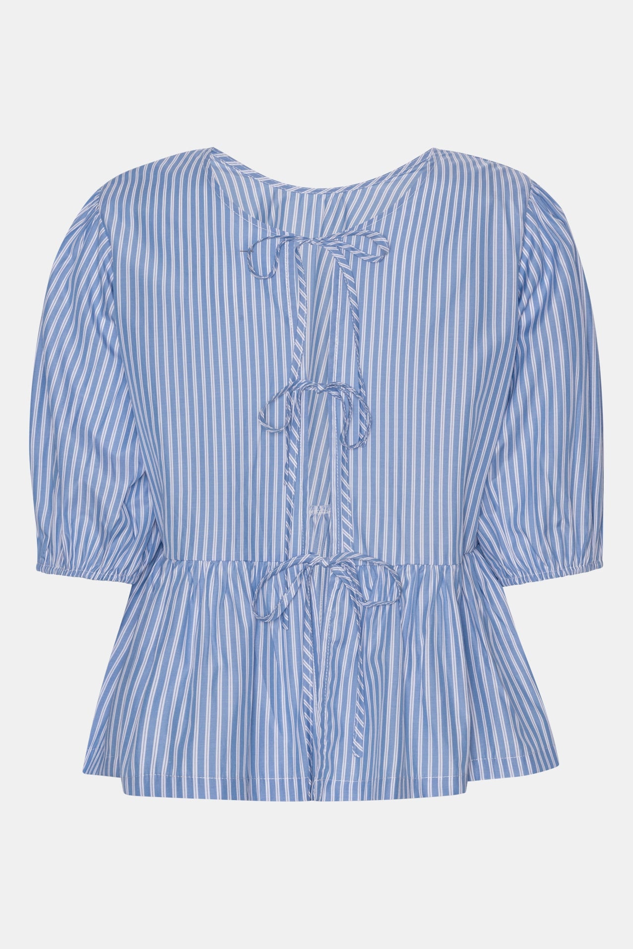 Striped tie top in blue and white with puffy sleeves. You can wear the top in 2 ways: with the ties on the front or in the back.