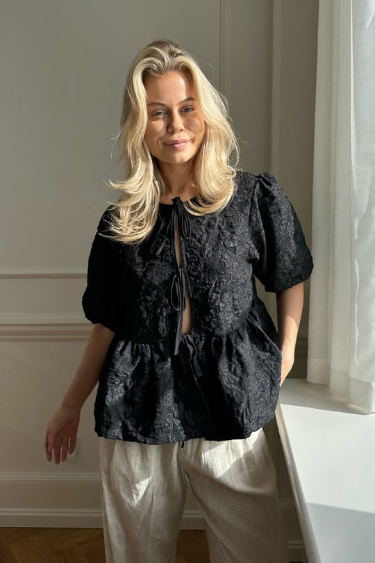 Black tie top in structured material and puffy sleeves. You can wear the top in 2 ways: with the ties on the front or in the back.