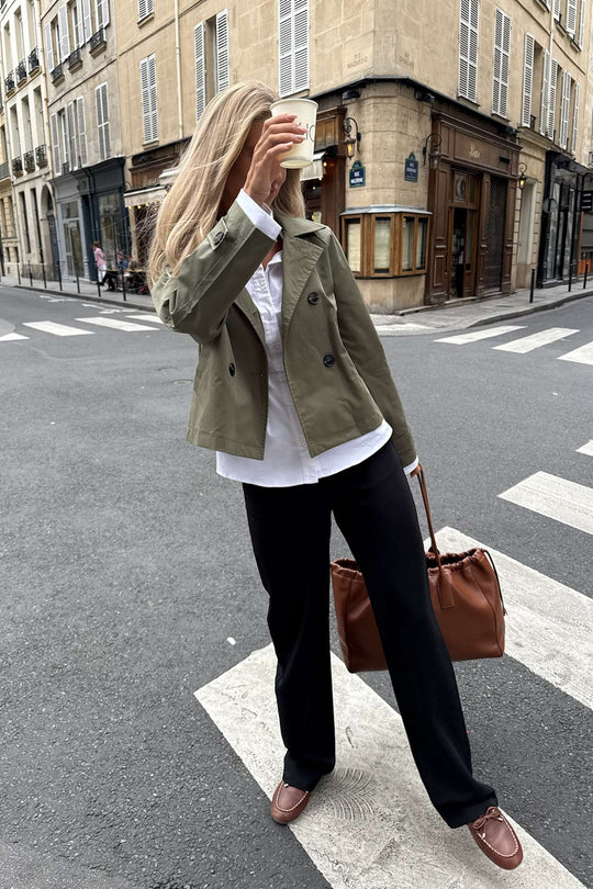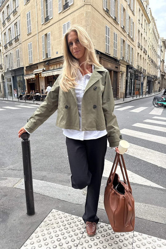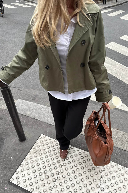 Elegant grön kort trenchcoat med lös passform. Trenchcoaten har naturfärgade knappar framtill för stängning och remdetaljer på ärmarna som även knäpps med en knapp. Den har två fickor i från och inget knytband.