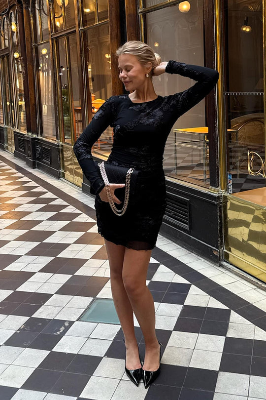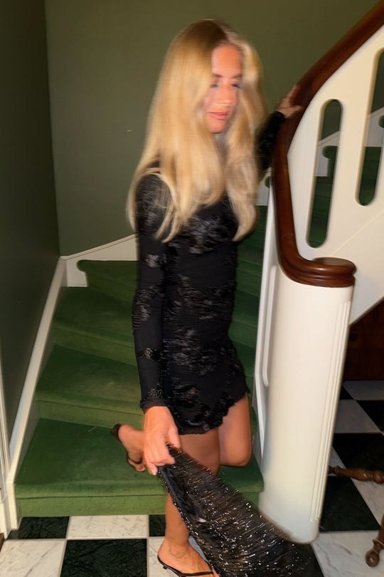 Kort och åtsittande meshklänning med 3D-blommor och långa ärmar.