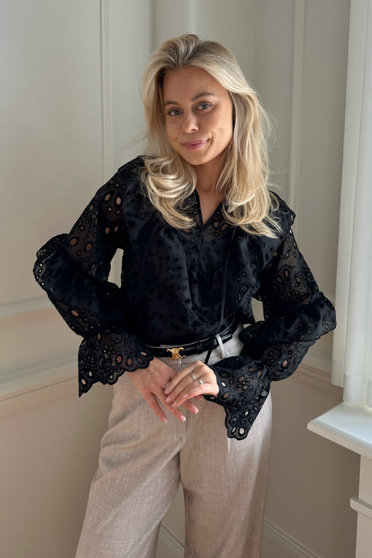 Black embroidery blouse with frills around the sleeves and in the front and a tie at the neck.