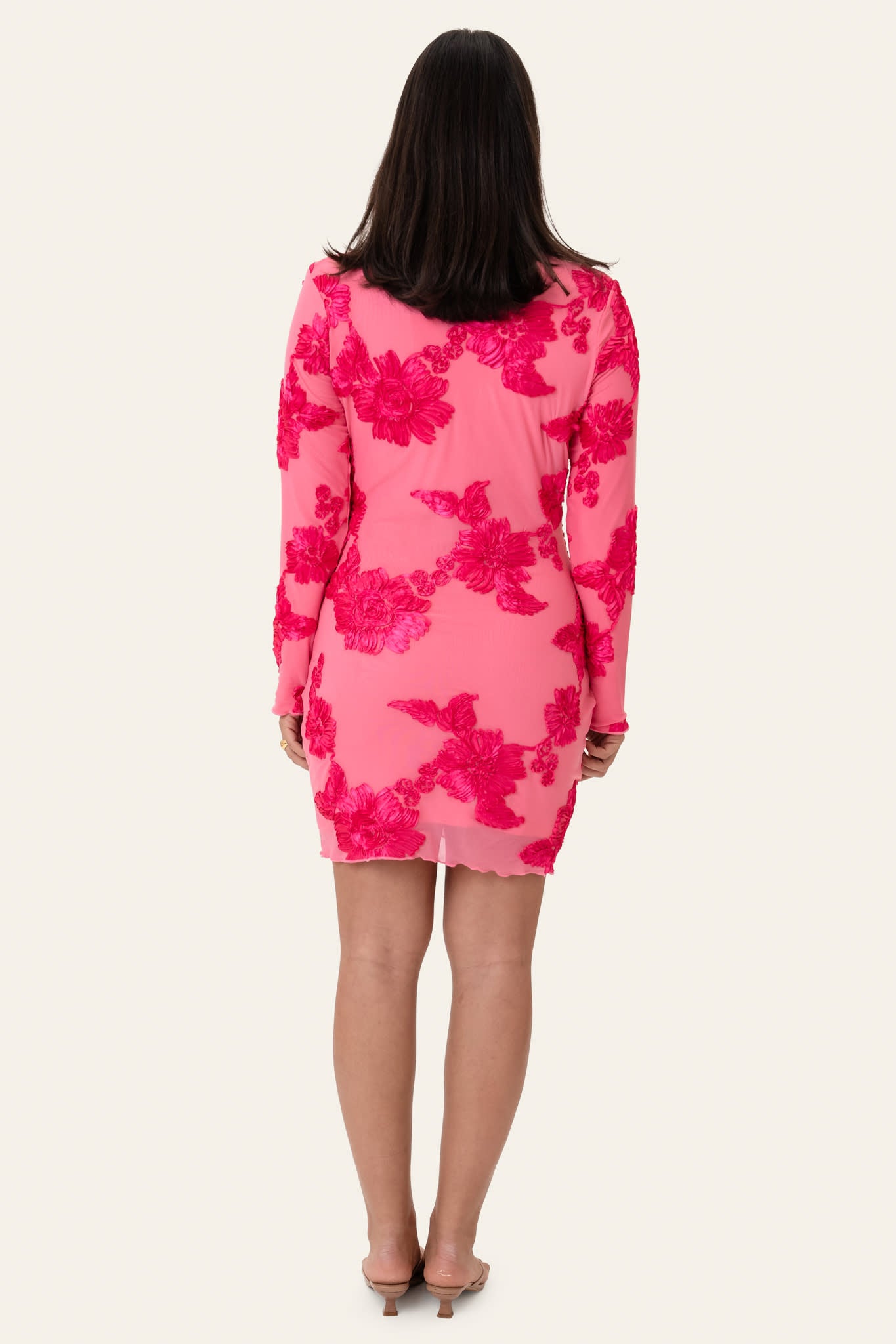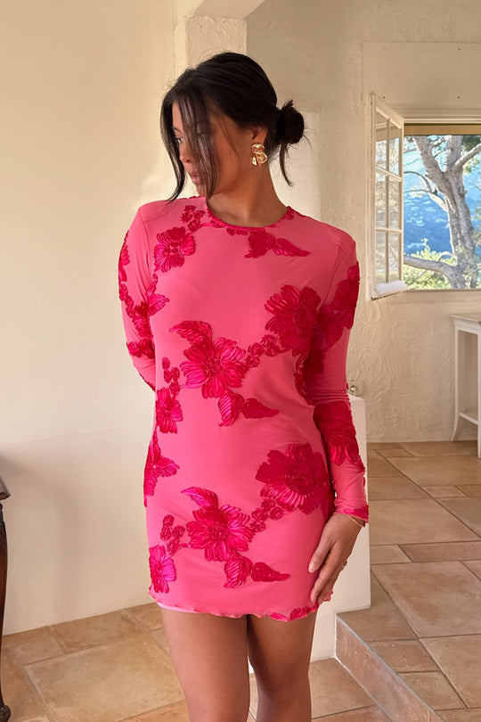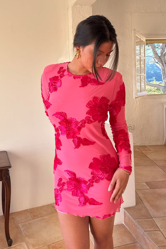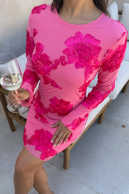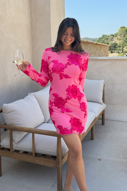 Elegant kort klänning i rosa med en figurnära silhuett. Klänningen har långa ärmar och rund halsringning. Den är prydd med 3D-blommiga detaljer, vilket ger extra karaktär åt designen. Klänningens kanter är avslutade med volangdetaljer.