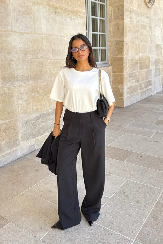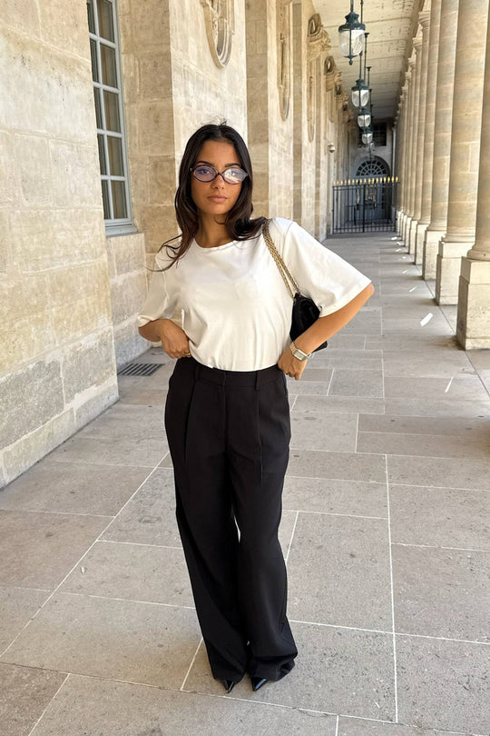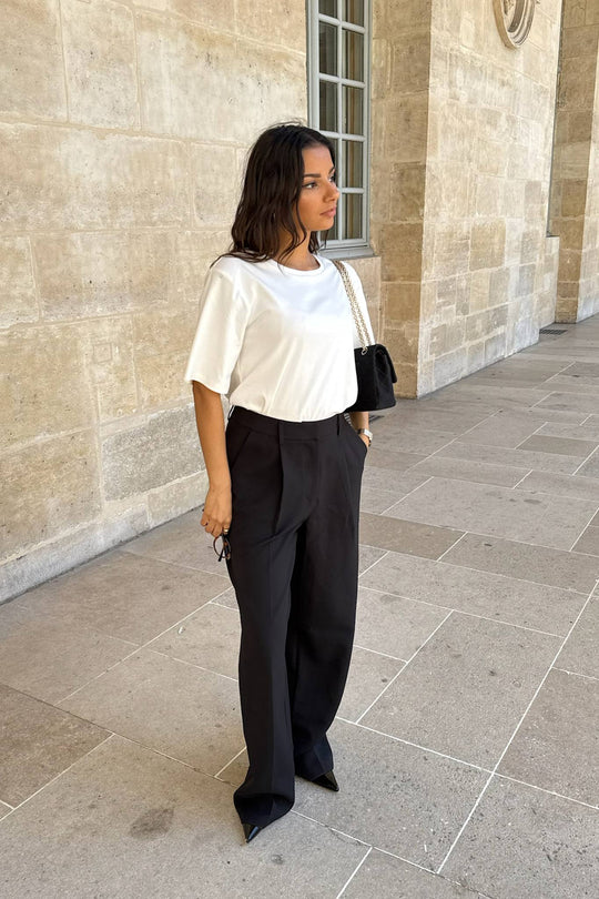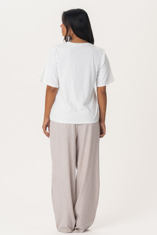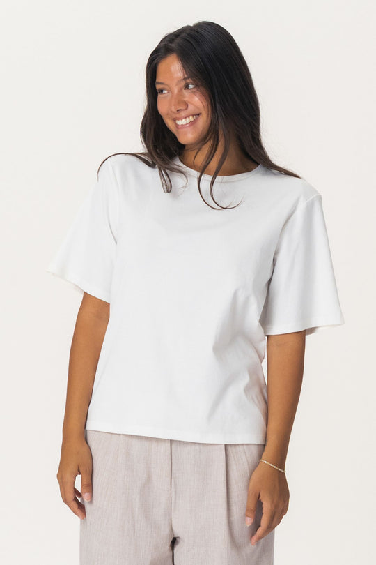 En enkel vit t-shirt med lös passform, korta ärmar och rund halsringning. T-shirten har axelvaddar för ett extra statement-utseende.