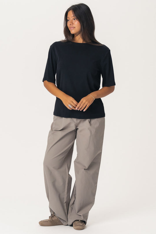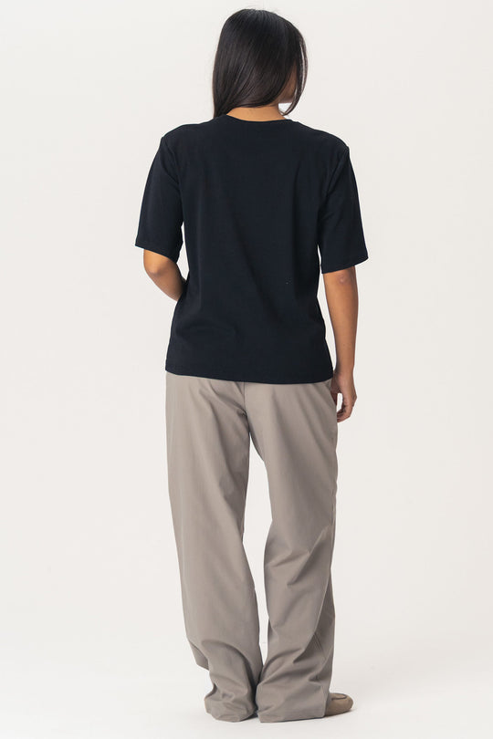 En enkel svart t-shirt med lös passform, korta ärmar och rund halsringning. T-shirten har axelvaddar för ett extra statement-utseende.