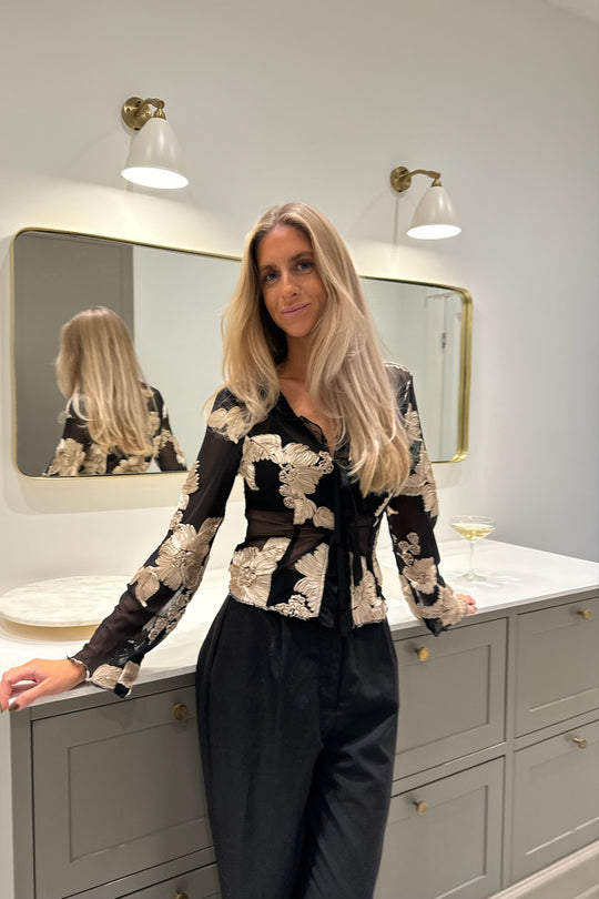Svart blommande meshtopp med 3D-blommor och slipsdetaljer.