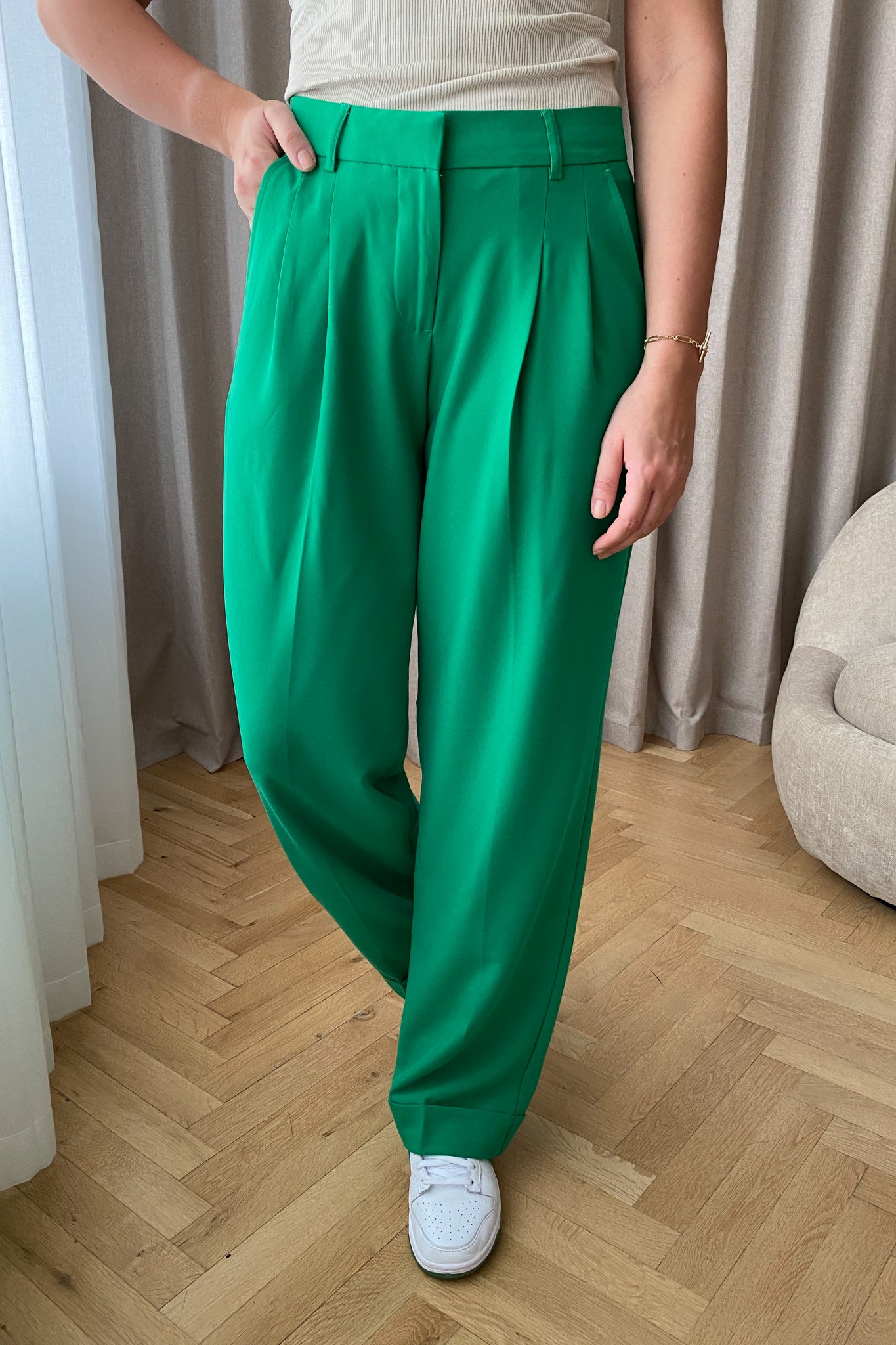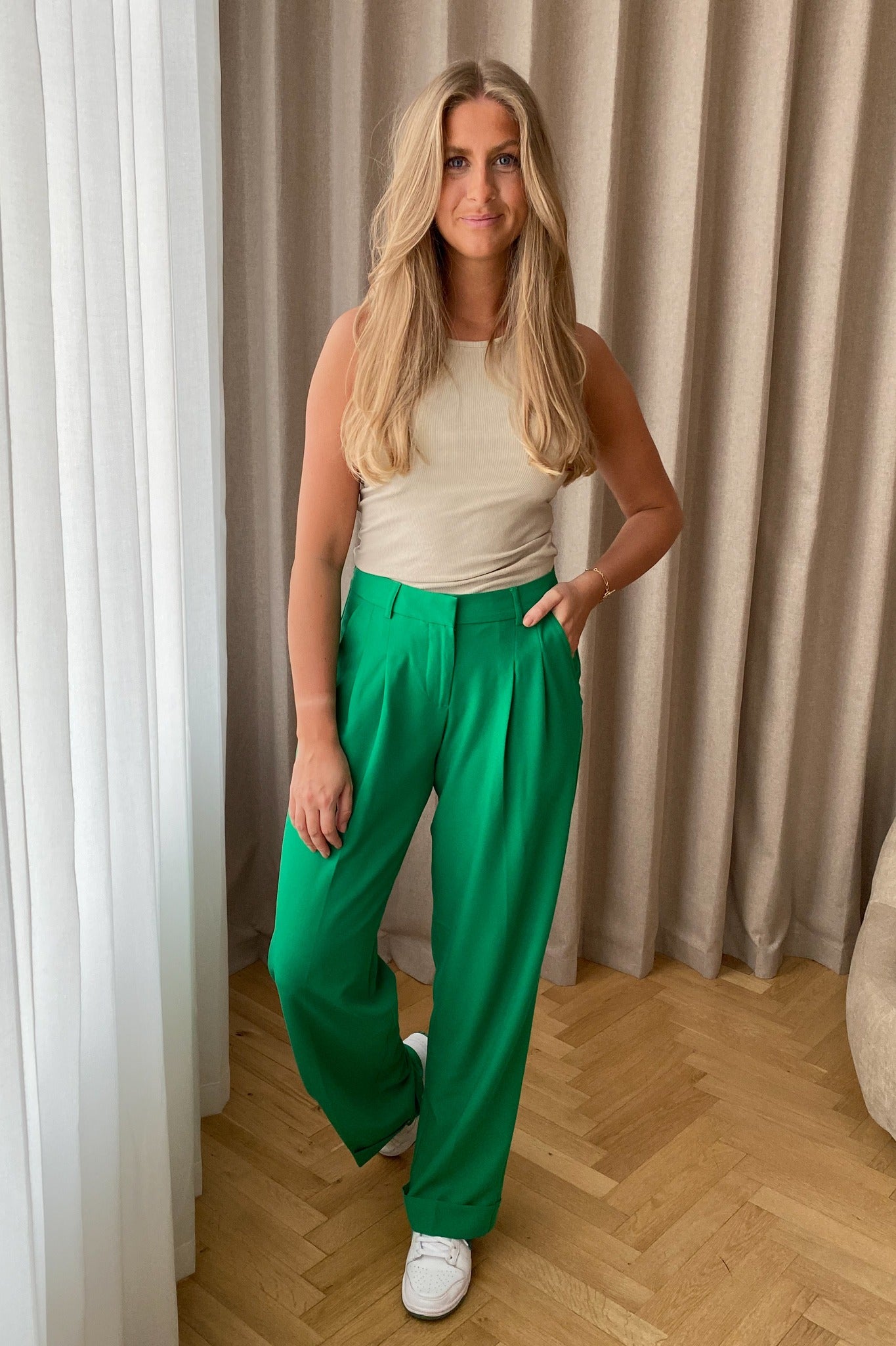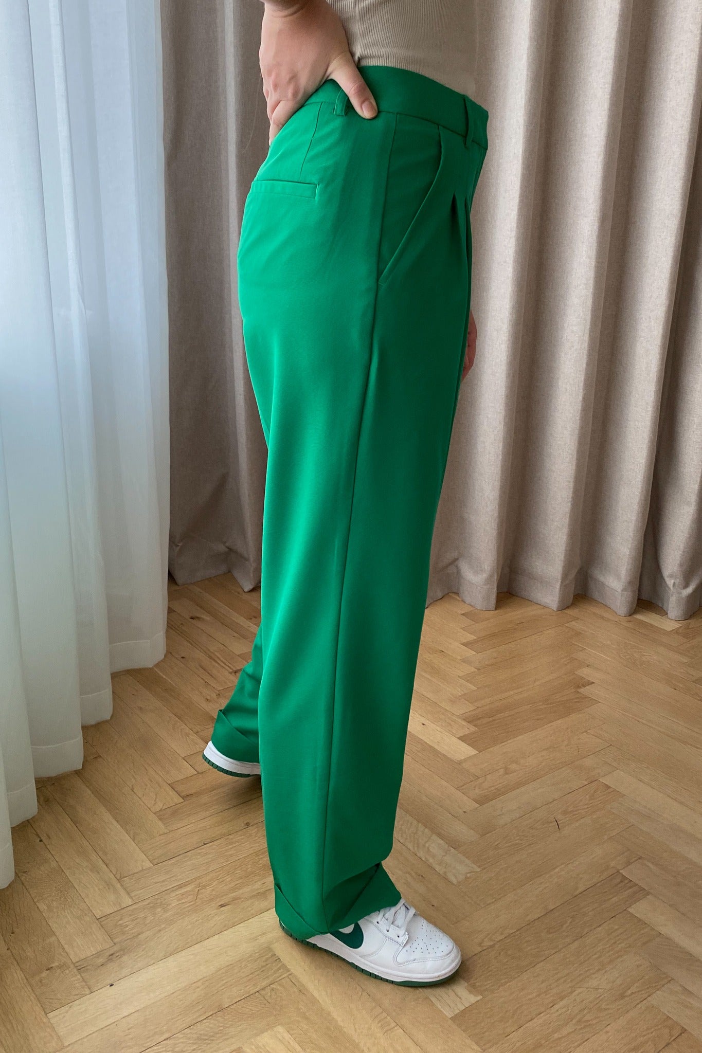 Super cool trousers in green with pockets and a zipper.