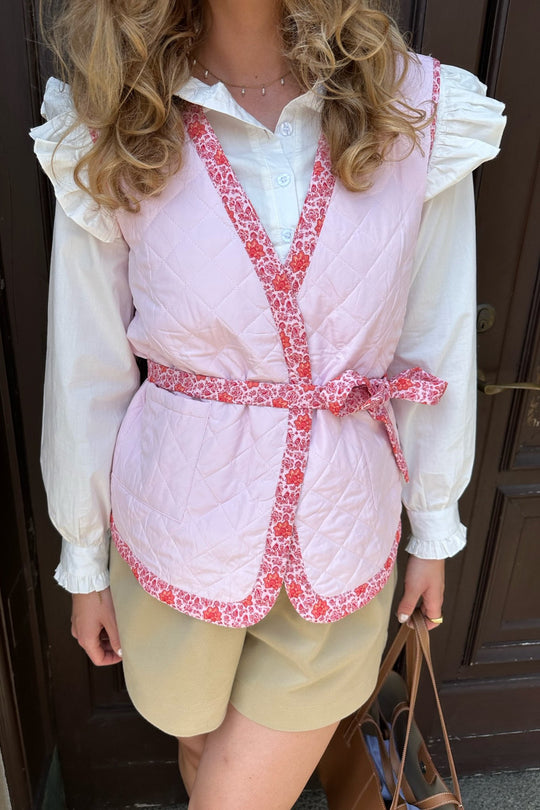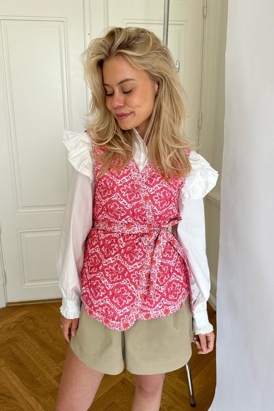 White vest with red pattern, a v-cut and has a tie around the waist.