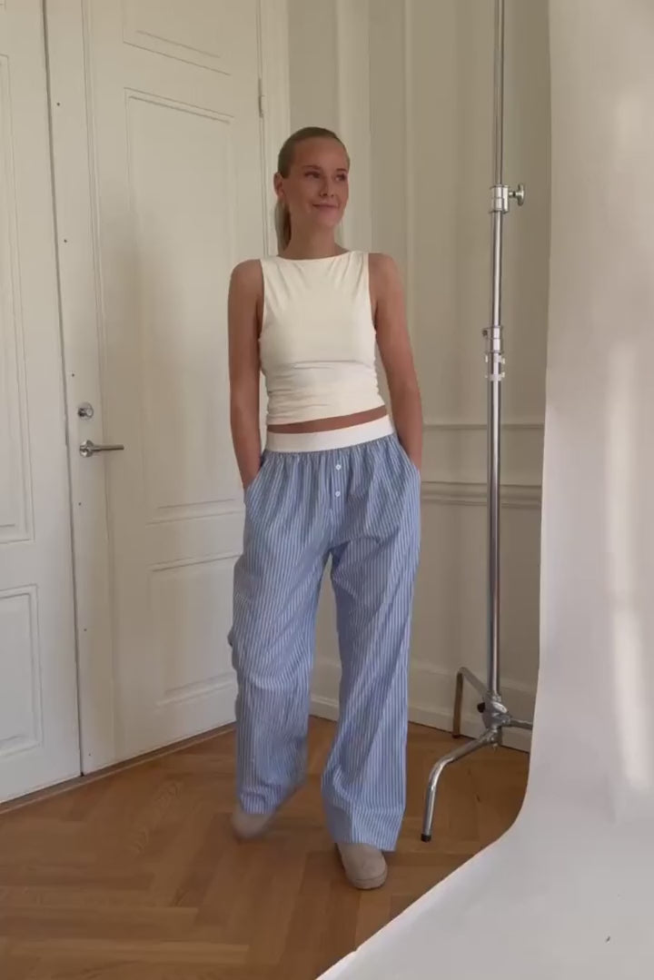 Blue and white striped pants with pockets on each side, a white elastic band in the waist and two buttons to give a more masculin boxer look.