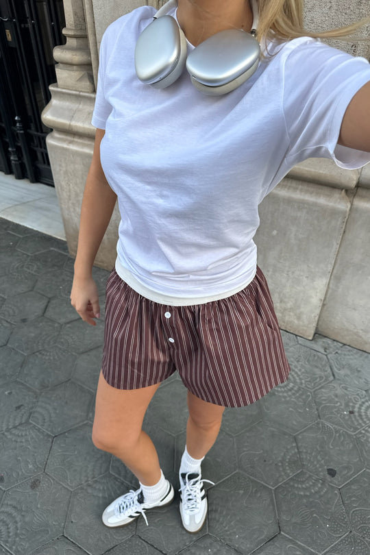 Dark brown and white striped shorts with pockets on each side, a white elastic band in the waist and two buttons to give a more masculin boxer look.