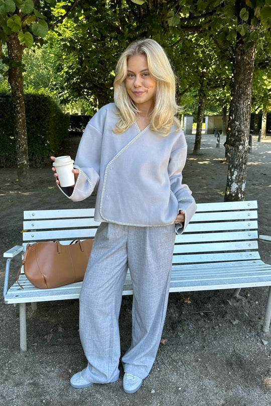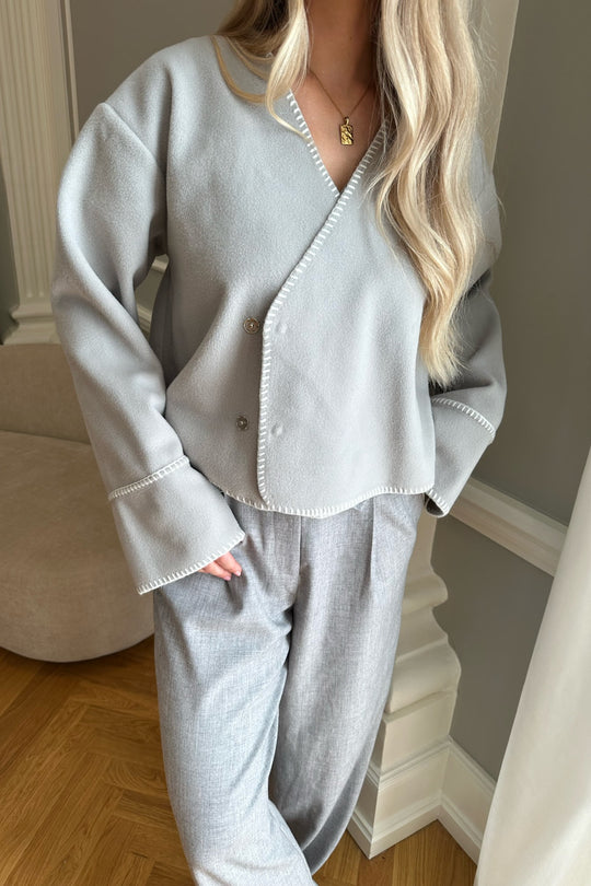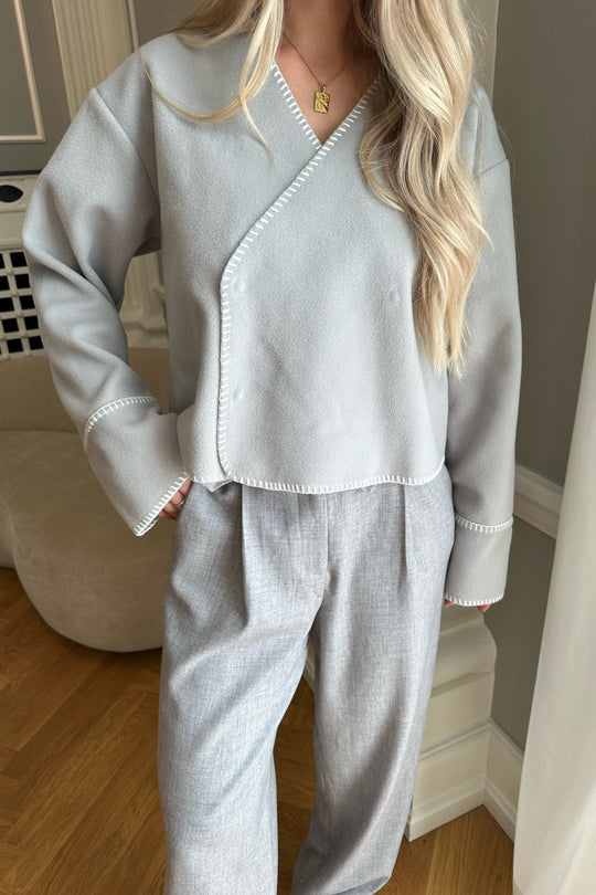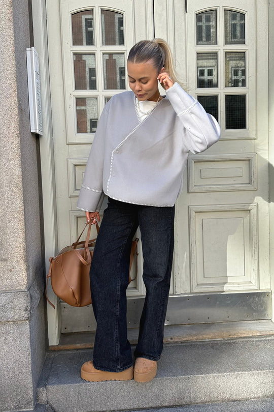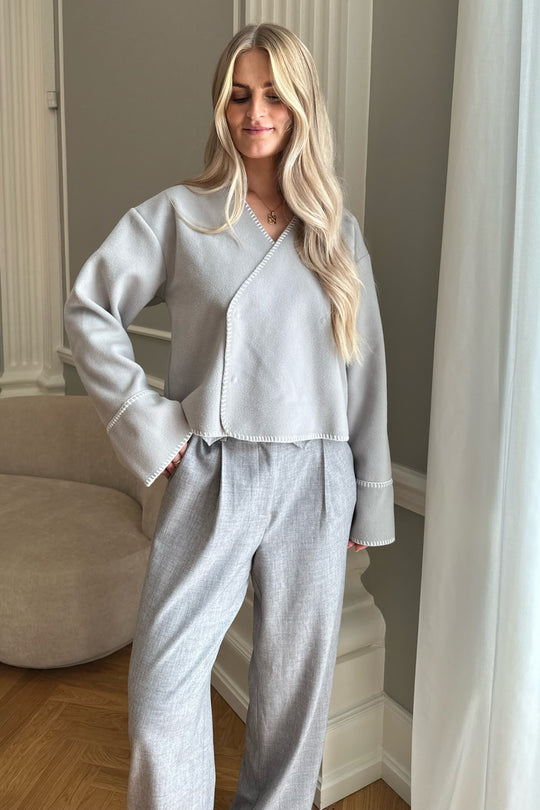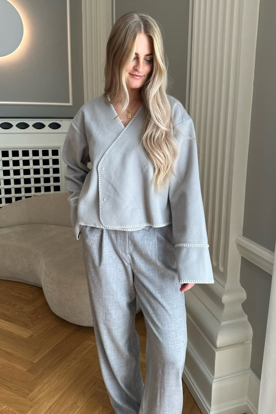 Light fleece transitional jacket with white stitching, wide sleeves, crossover effect and push buttons as closure. Use it as a jacket or cardigan.