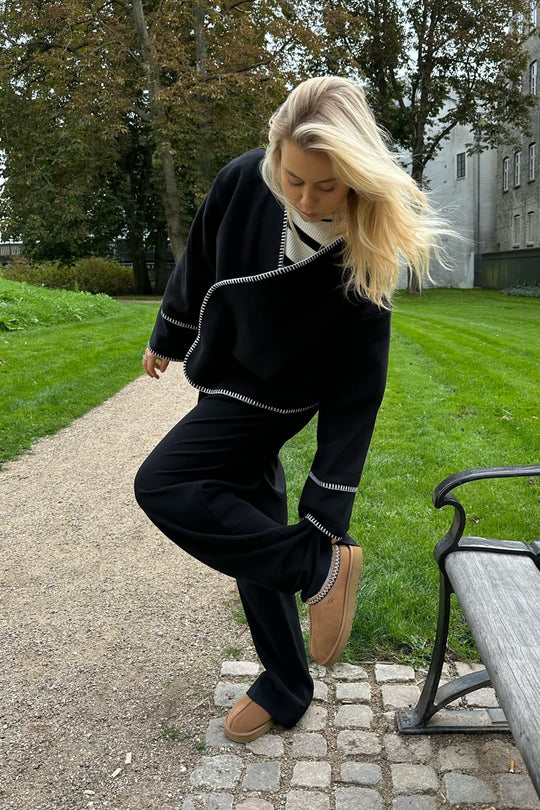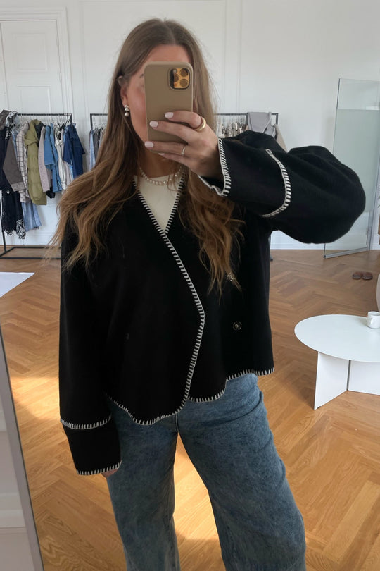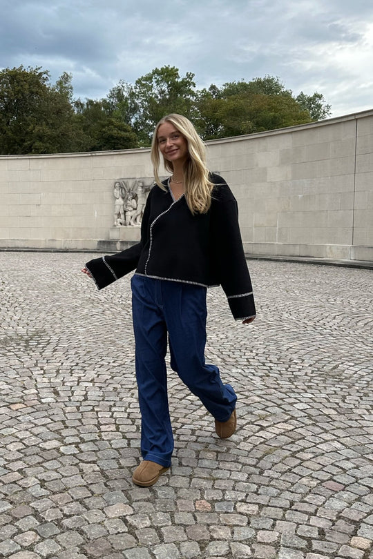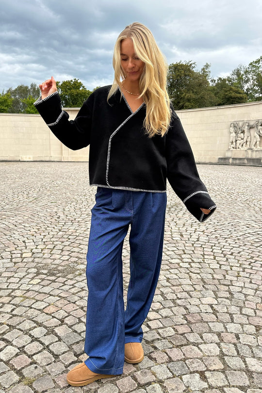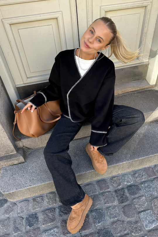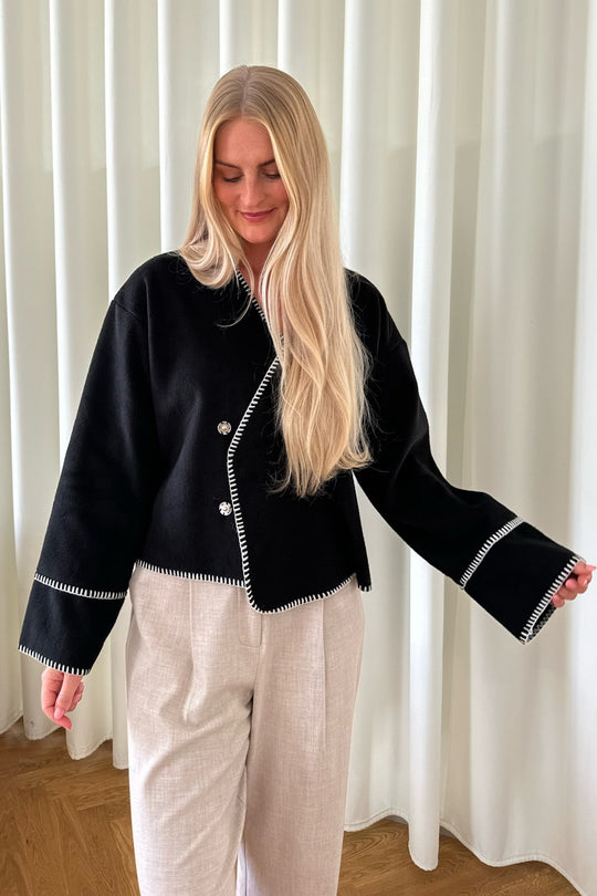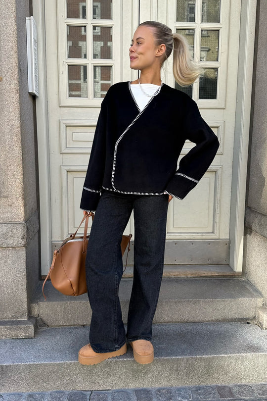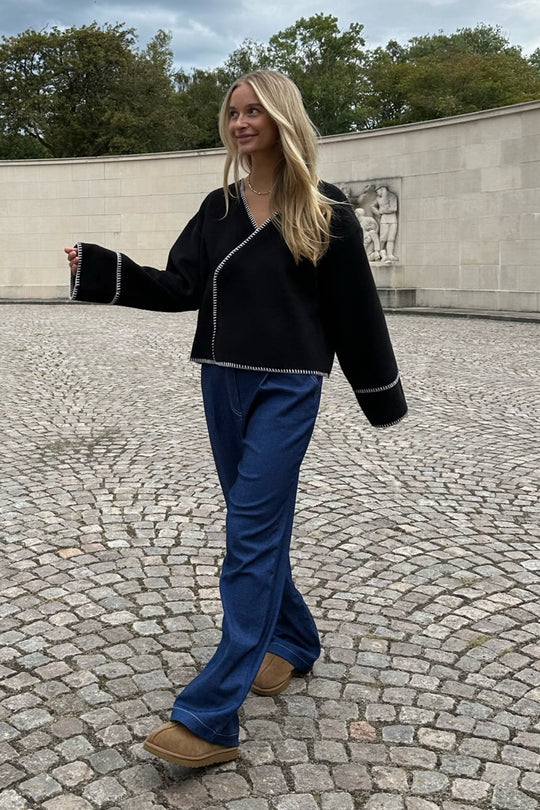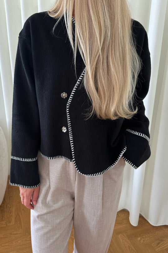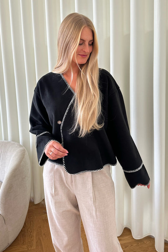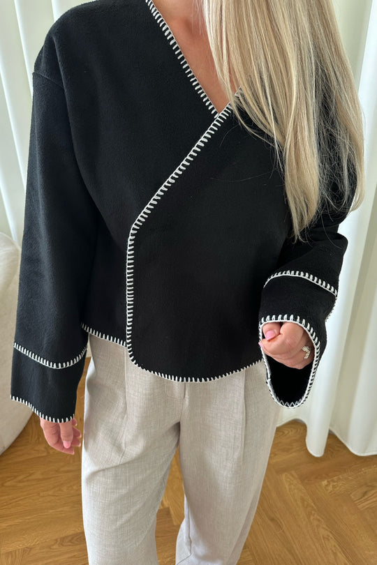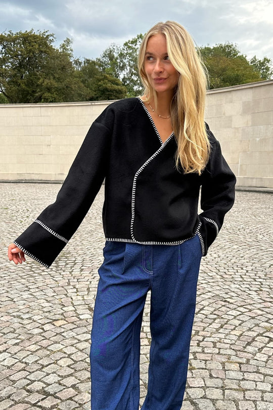 Light fleece transitional jacket with white stitching, wide sleeves, crossover effect and push buttons as closure. Use it as a jacket or cardigan.
