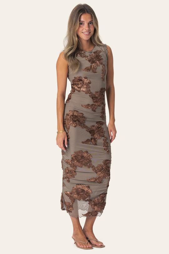 Elegant långklänning i ljusbrunt med en figursydd siluett. Klänningen har korta ärmar och en rund halsringning. Den är prydd med bruna 3D-blommiga detaljer genomgående, vilket ger extra karaktär till designen. Kanterna på klänningen har volangdetaljer, och ryckningen på sidorna gör att du kan justera längden för en kortare look.