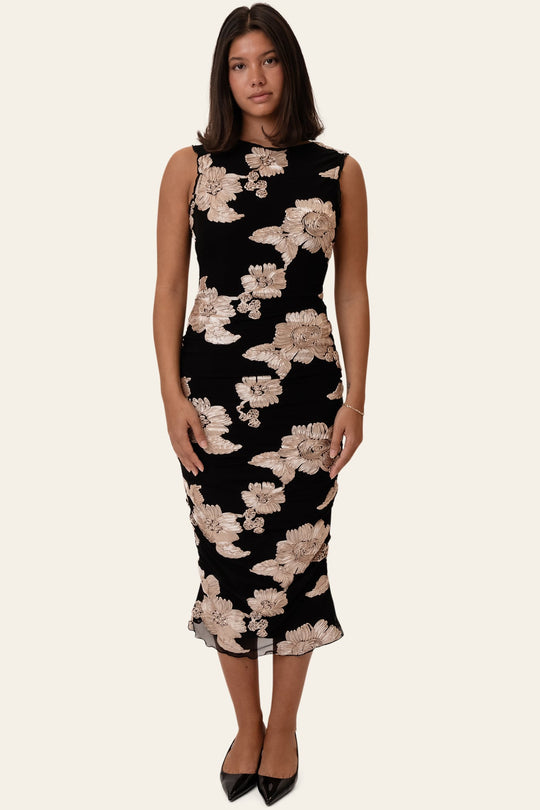 Elegant lång klänning i svart med en figursydd siluett. Klänningen har korta ärmar och en rund halsringning. Den är prydd med beige 3D-blommiga detaljer genomgående, vilket ger extra karaktär till designen. Kanterna på klänningen har volangdetaljer, och ryckningen på sidorna gör att du kan justera längden för en kortare look.